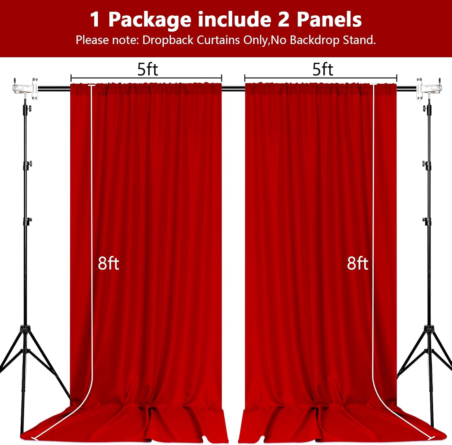 - DIMENSIONS: Each order is for 2 (two) polyester curtains. Each curtain measures 5 feet wide x 8 feet high. Entire backdrop measures 10 feet wide x 8 feet high.Each curtain panel comes with 4 inch rod pocket on top, fit up to any standard rods. (Please note: Dropback Curtains Only,No Backdrop Stand.)