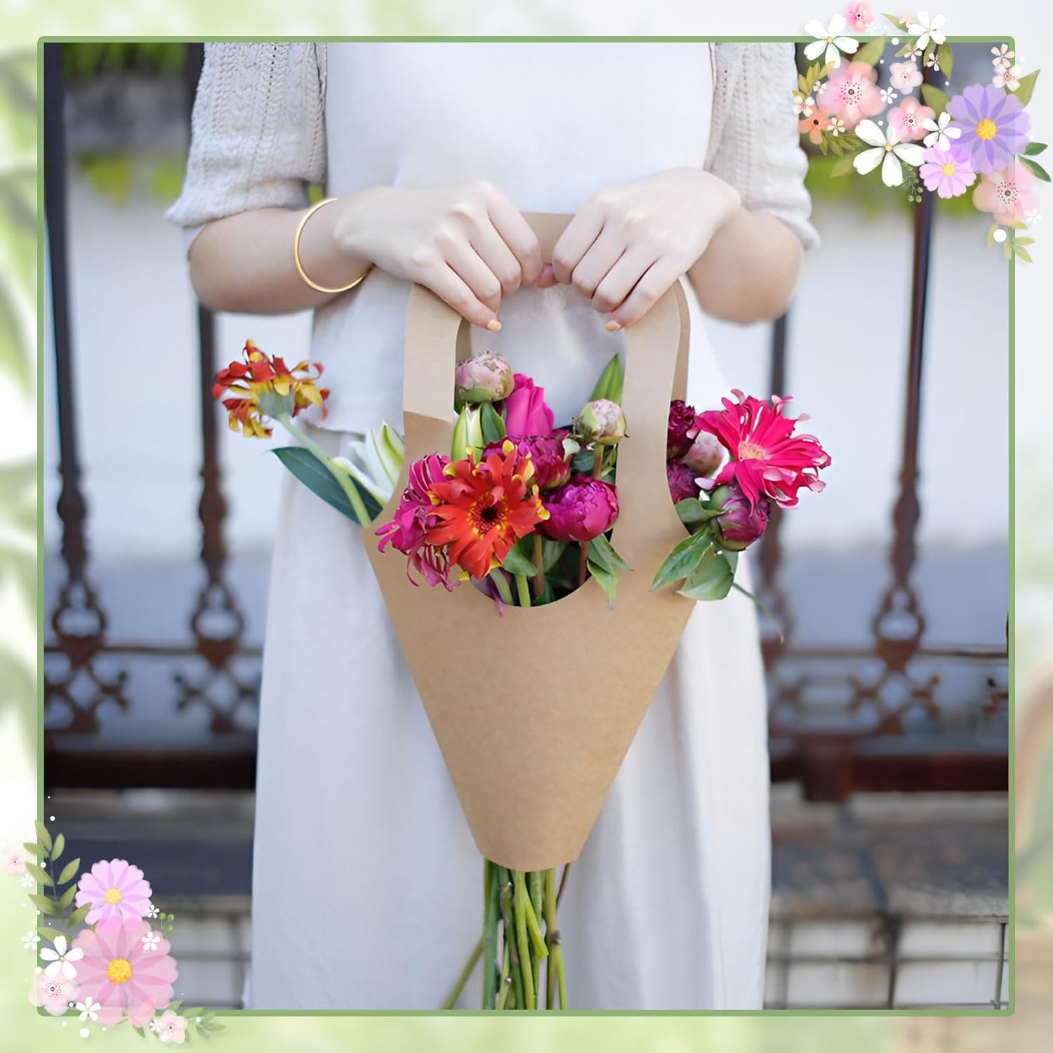 - 【Kraft Paper Material】 This flower bags for bouquets is made of reliable kraft paper material, sturdy and thick, safe and not easy to break or tear, lightweight and reliable, odorless and comfortable to touch, ideal for displaying beautiful bouquets or flower arrangements.
