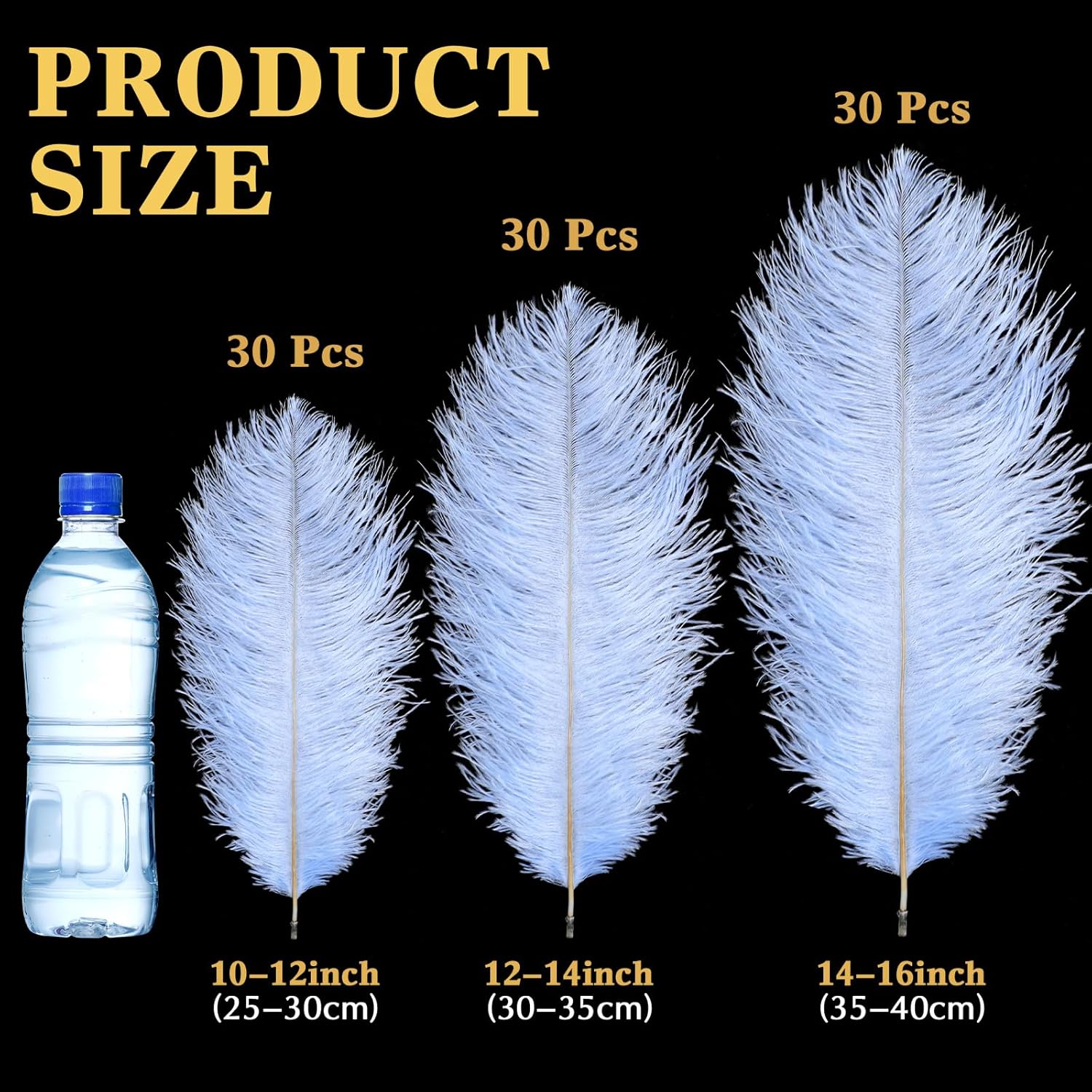 - Package Include: you will get 90 pieces large natural ostrich feathers in 3 different sizes, 14-16 Inch (35-40cm), 12-14 Inch (30-35cm), 10-12 Inch (25-30cm), 30 pieces of each size, enough quantity to meet your DIY usage needs, suitable for making many kinds of handicrafts or table decorations, create a romantic and beautiful atmosphere