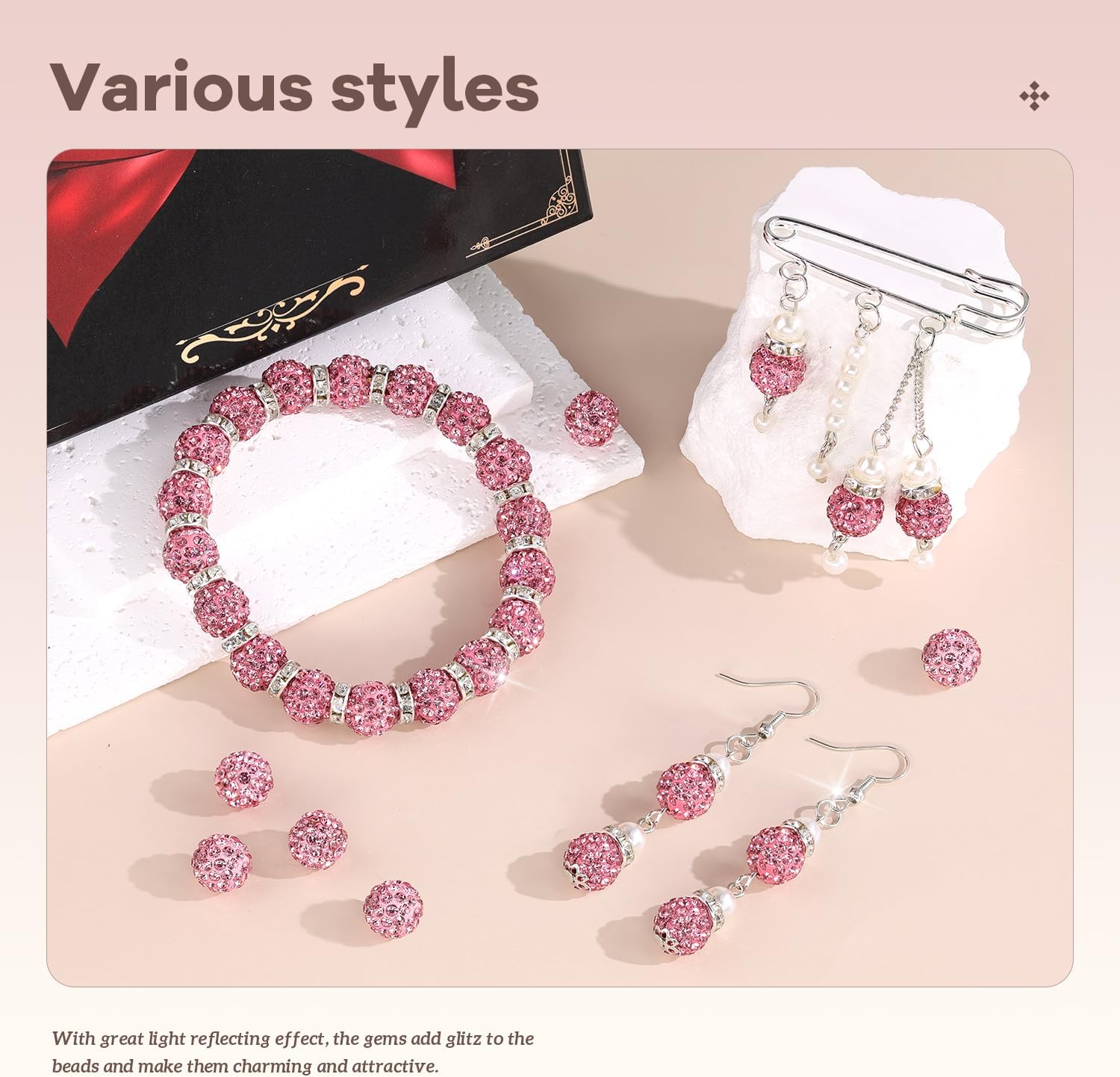 - BLING EFFECT -- Our rhinestone beads are made of polymer clay, embedded with superior quality glass rhinestones. We do quality control management to ensure the high quality of the bling beads. Rhinestones cover the entire surface and are not easy to fall off, shining like a diamond. With great light reflecting effect, the gems add glitz to the beads and make them charming and eye-catching. Wearing ornaments made from these beads, you will be the center of attention.