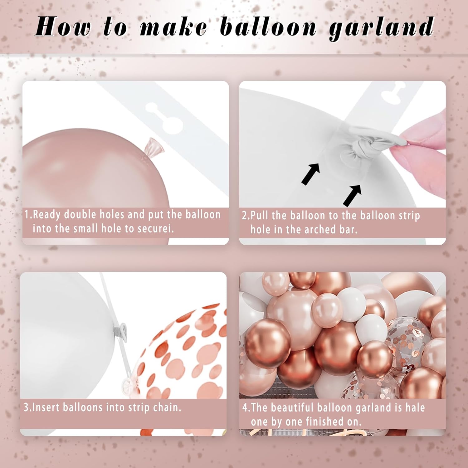 - 【Easy Assembly】-We provide glue dots and decorative strips,so even if you are using the rose gold balloon kit for the first time,you can easily complete the assembly.Inflate the balloons with a pump,use the decorative strips to form the balloons into a chain,fix the balloons on the wall/stair handrail/background with glue dots,and then place rose gold burst balloons on the balloon chain, and you have completed the assembly of the balloon chain!