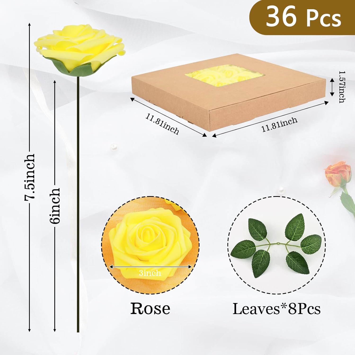 - Kindle Your Creative Flames: The box includes 36 yellow roses (3" flower head, 8" stem) and 8 green rose leaves, perfect for an array of DIY crafts. Whether creating wedding bouquets, graduation or birthday party ornaments, baby shower decorations, or cake adornments, our faux roses add a touch of class to every important moment.