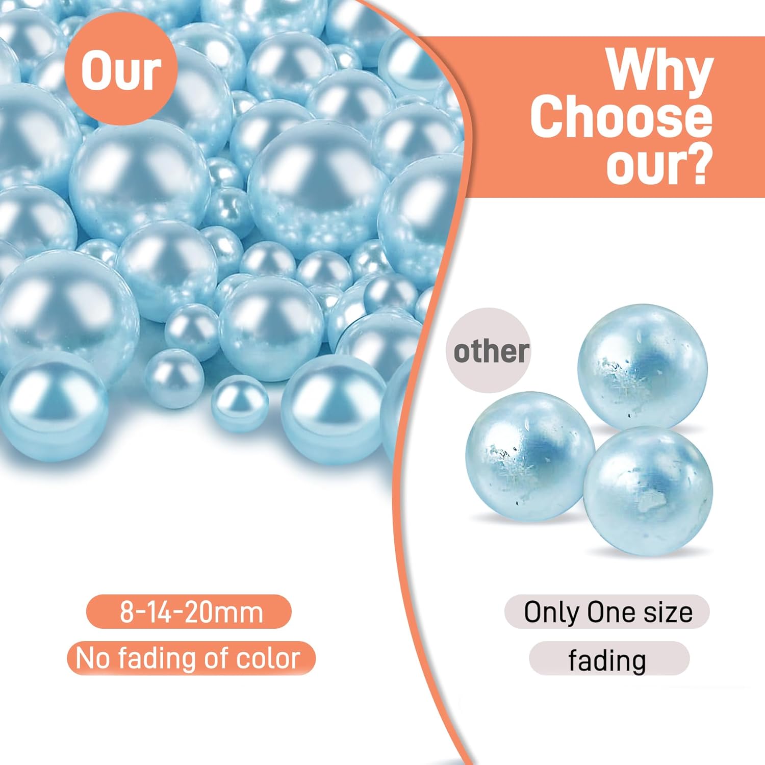120 PCS 8/14/20mm No Hole Polish Pearl Beads for Centerpiece, Light Blue Beads Decorative Vase Fillers, Plastics Pearls for Vases, Table Scatters, Wedding Party Decor
