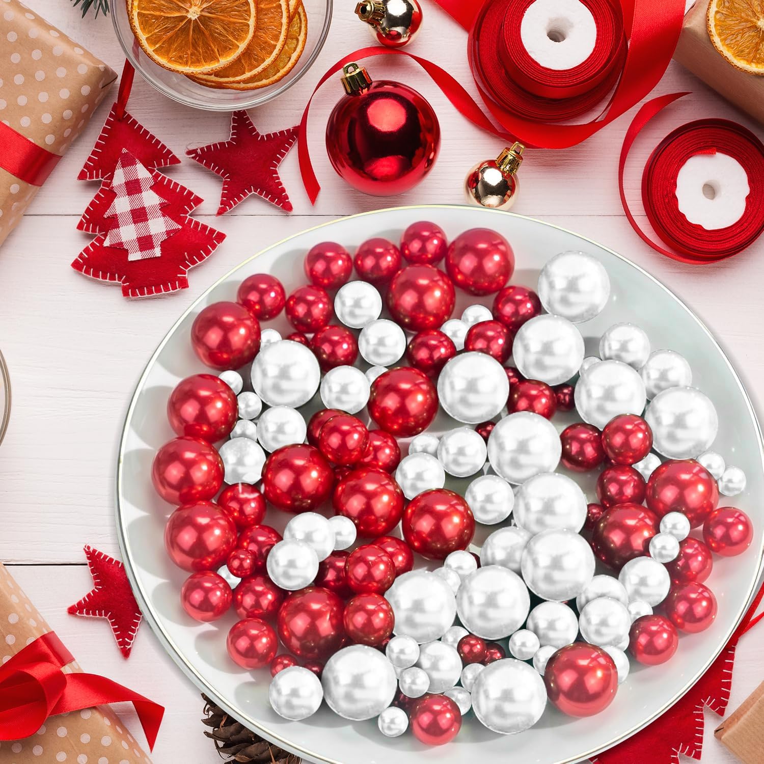 300Pcs Red&White Polished No Hole Pearl Beads Vase Filler, Christmas Vase Filling Decorations, Plastic Pearls, Table Scatters, Wedding Home Decor, 8/14/20 mm