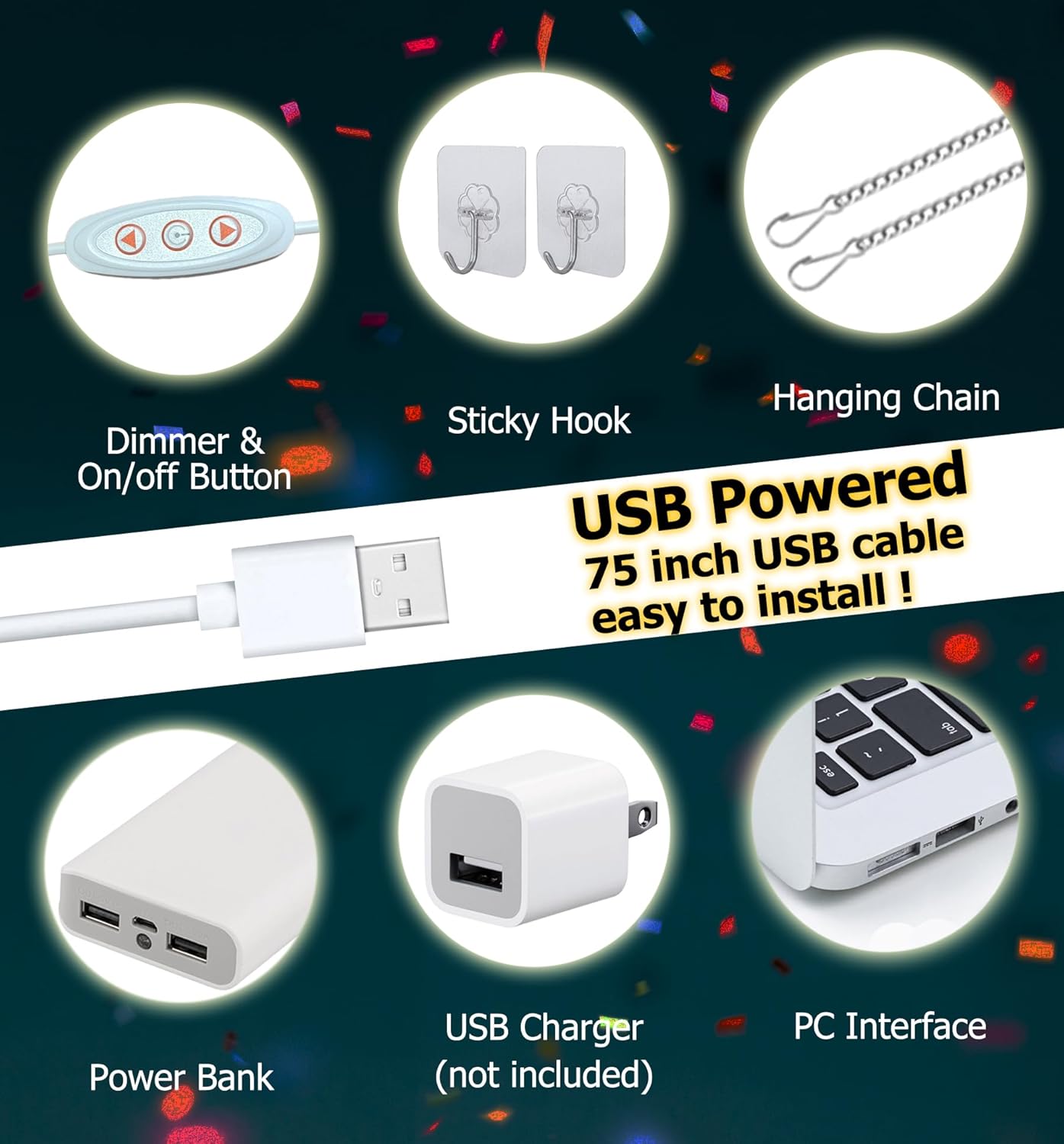 - EASY FLEXIBLE TO INSTALL - this light up neon sign is including mounting chain with clips and sticky hooks.There are two drilled holes on every acrylic board.You can directly nail the product to the wall with screws or hang it on other backdrop with mounting chains and hooks,Flexible USB charged,just insert the usb interface into a computer or a usb port plug