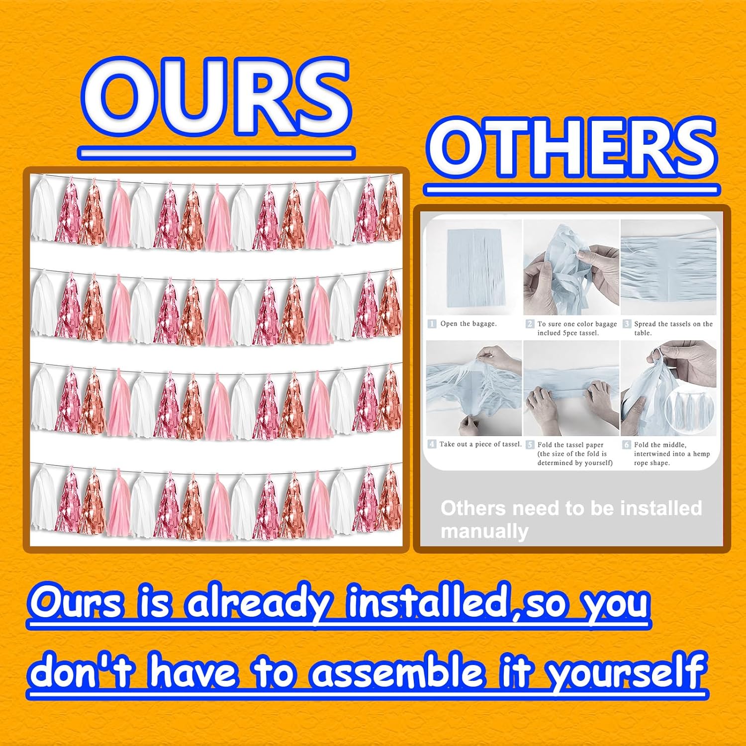 - 【Package Includes】The total length of the rose gold pink white birthday tassels banner is 40 feet, divided into 4 strips, each 10 feet long. Each banner contains 15 tassels, and each tassel measures 14 inches, for birthday decorations many occasions uitable for Patriotic display, Homecoming Float, Christmas Float, ecorative metal trailers, graduation floats etc