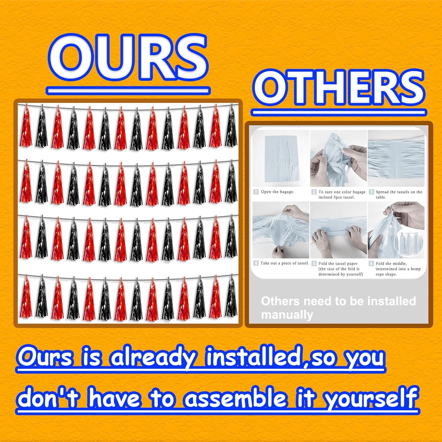 - 【Package Includes】The total length of the black red birthday tassels banner is 40 feet, divided into 4 strips, each 10 feet long. Each banner contains 15 tassels, and each tassel measures 14 inches, for birthday decorations many occasions uitable for Patriotic display, Homecoming Float, Christmas Float, ecorative metal trailers, graduation floats etc