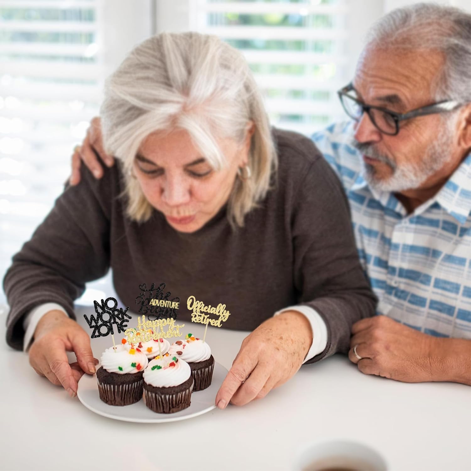 24Pcs Happy Retirement Cupcake Toppers Officially Retired Cake Toppers No Work Zone Adventure Begins Cupcake Picks Retirement Theme Farewell Birthday Party Decorations Supplies Black Gold