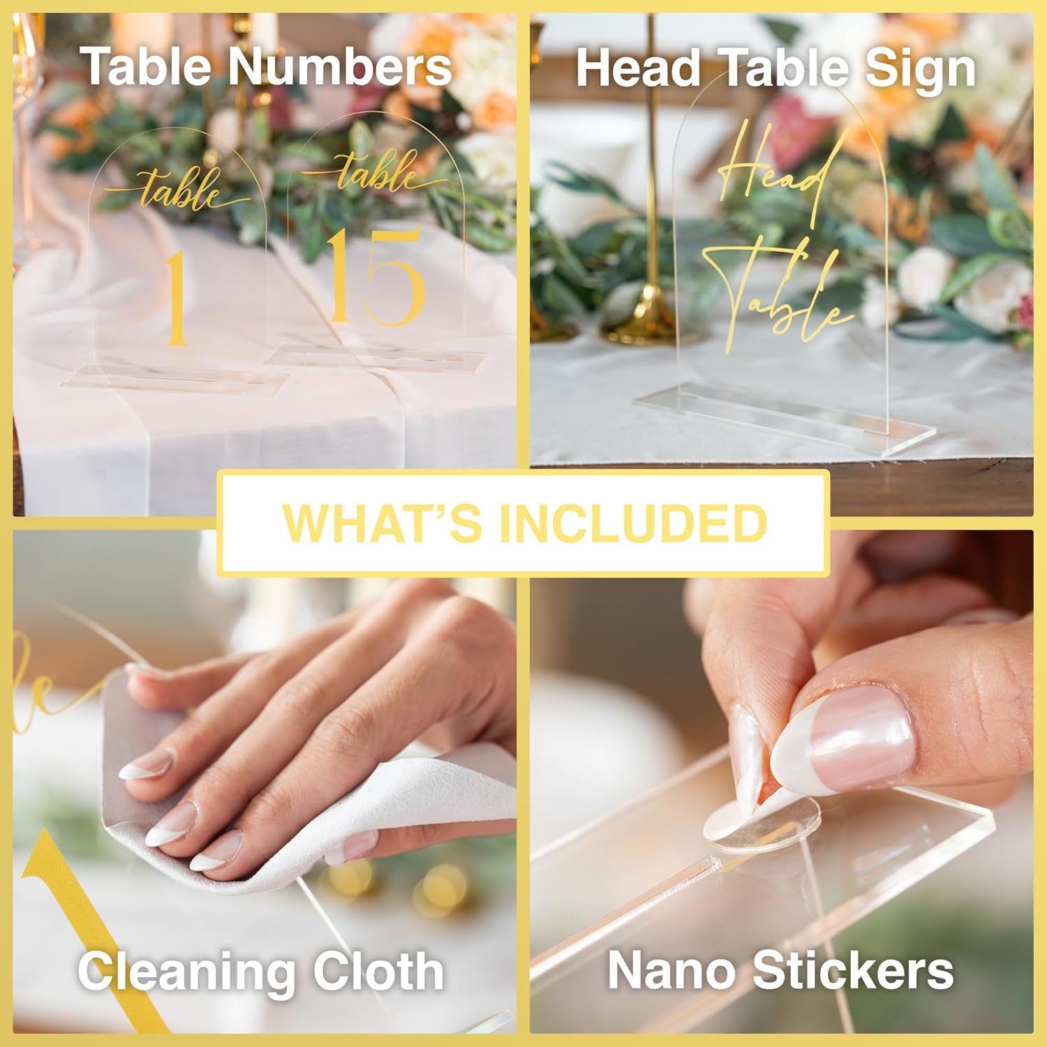 - ➡️ 𝘾𝙊𝙉𝙎𝙏𝙍𝙐𝘾𝙏𝙀𝘿 𝙒𝙄𝙏𝙃 𝙌𝙐𝘼𝙇𝙄𝙏𝙔 𝘼𝘾𝙍𝙔𝙇𝙄𝘾: Our ultra-durable acrylic wedding signs for seating chart come in four styles: 5" x 7" Clear with Gold Print, Clear with White Print, Black with White Print or Frosted with White Print, in Numbers 1-10, Numbers 1-15 or Numbers 1-20; Plus, all of our table number sets come with a Head Table Sign and a Gift table Sign