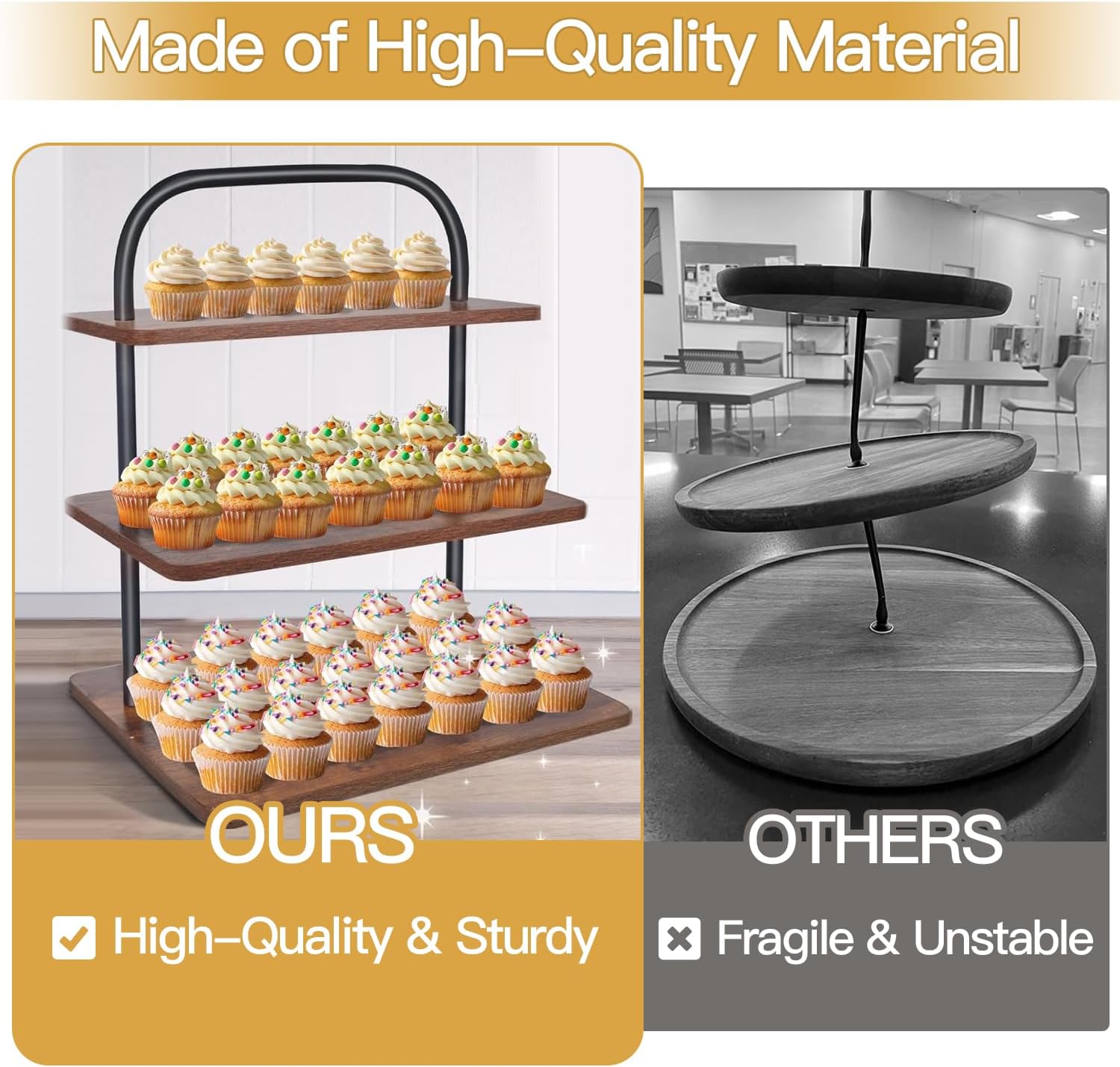 - [Sturdy and Reliable] To ensure durability, the cupcake display stand utilizes 0.7" diameter metal tubes for connections and 0.47" thick wooden boards. Additionally, it includes 4 pads to prevent slipping and maintain stability.