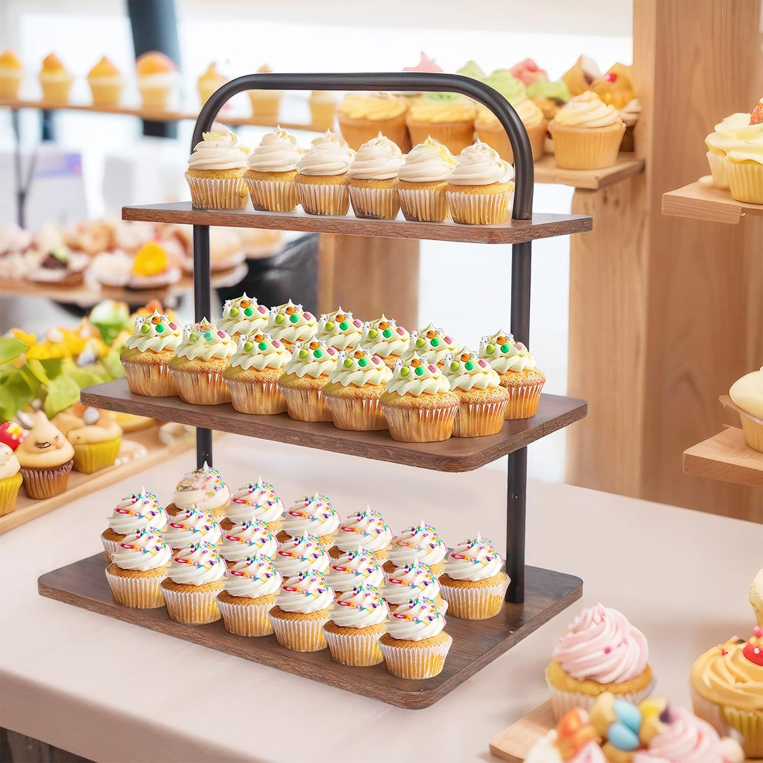 - [Cupcake Stand for 50 Cupcakes] The cupcake stand features a 3-tier square wooden board structure, capable of effortlessly accommodating up to 50 cupcakes measuring 2" each. The largest board measures up to 15.7” Lx11.8” W. The 3 tier large cupcake stand meets various party needs and is designed with a height difference of 6" for easy access.