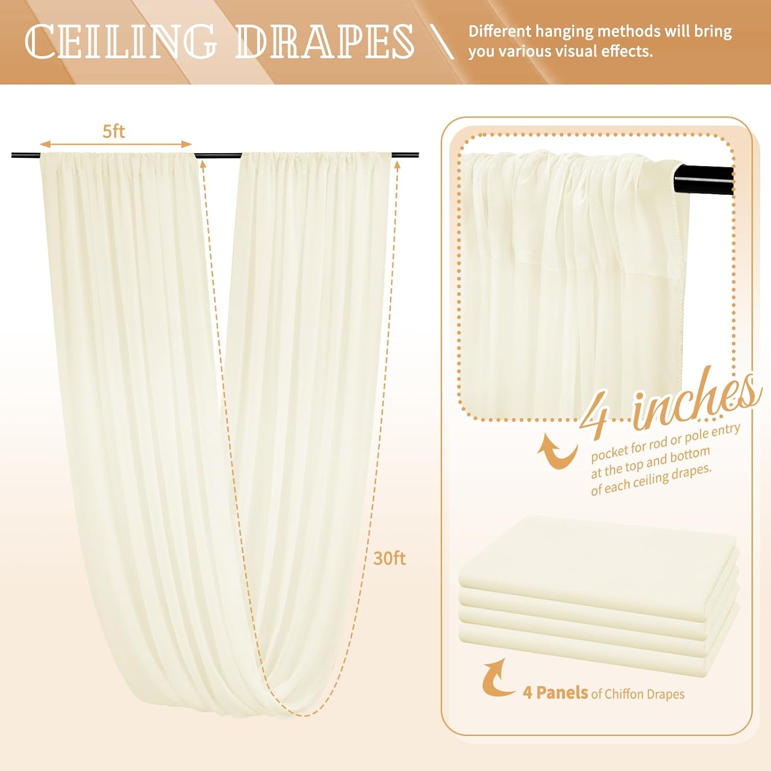 4 Panels Ivory Ceiling Drapes for Wedding 5ftx30ft Sheer Drapery Chiffon Fabric Arch Draping Curtains for Party Ceremony Birthday Baby Shower Reception Stage Ceiling Decorations