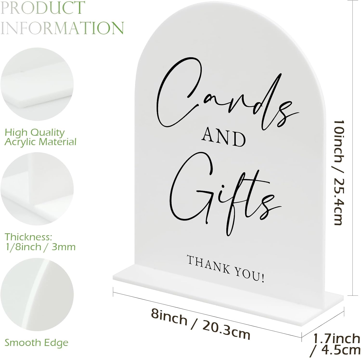 - Stable and Durable: Our white arch acrylic cards and gifts sign easily fits into the slot located in the middle of the acrylic base, ensuring it stays upright and securely in place. The acrylic sign base is made of 1/8" thick acrylic material, sturdy and durable, they can keep the table cards stand steadily.