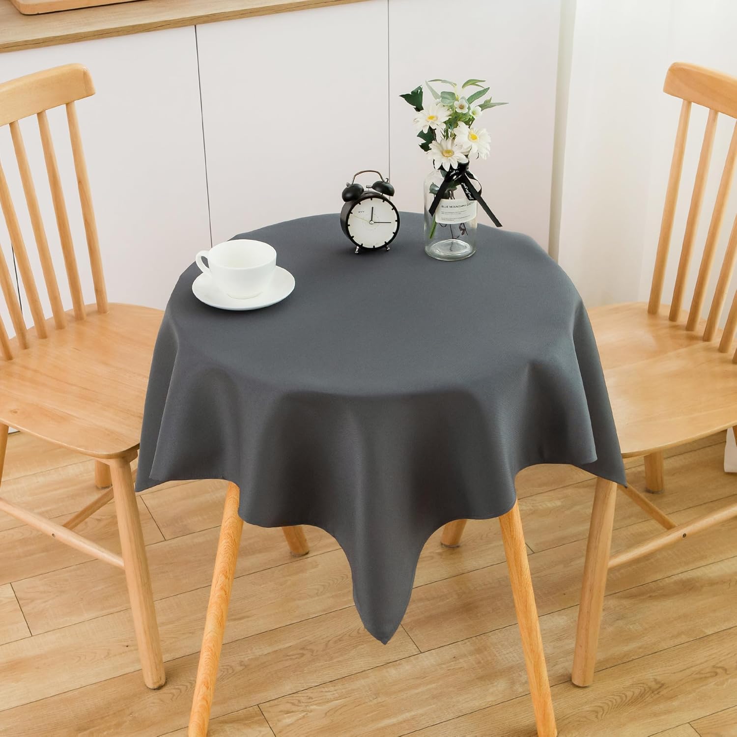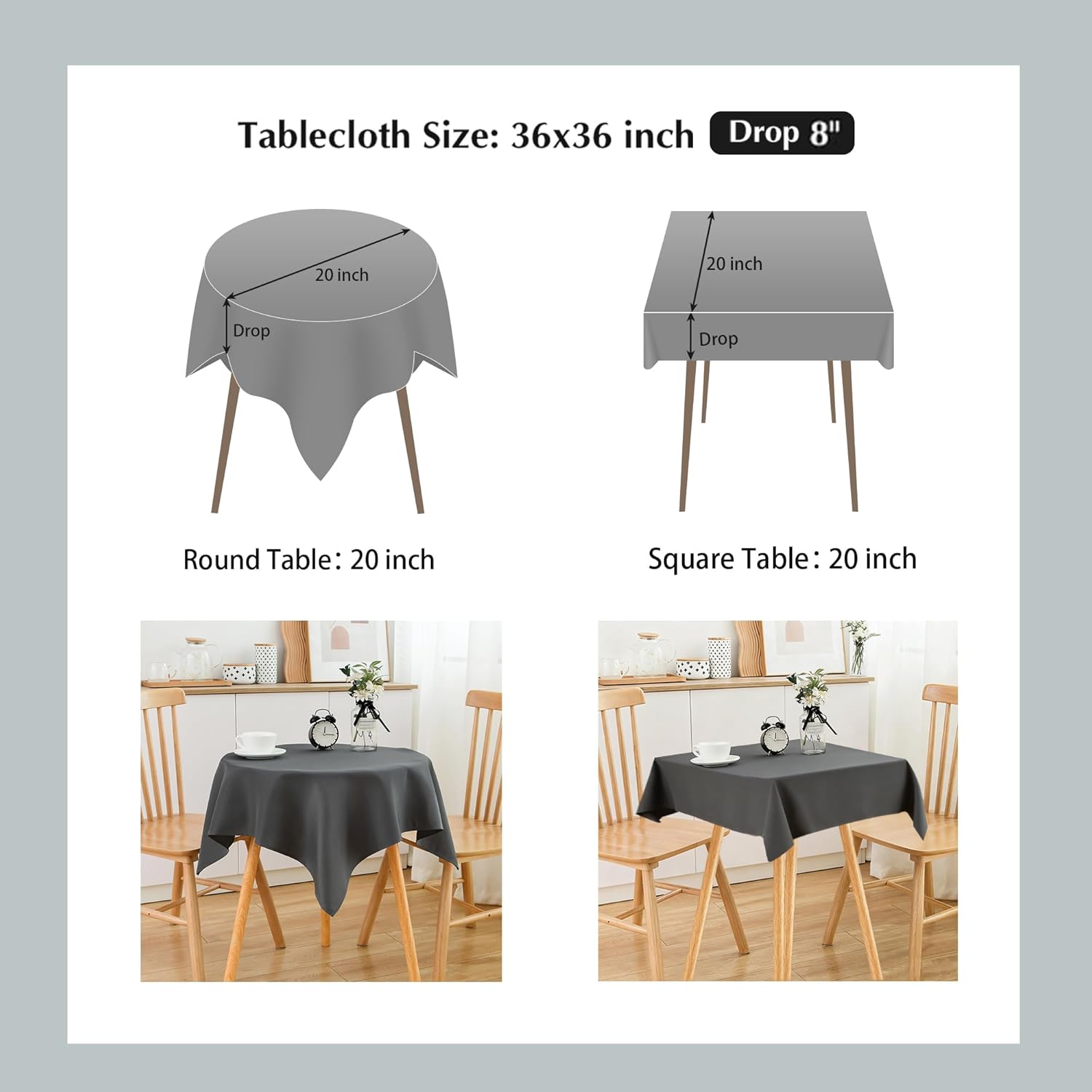 - Size Guide: Each package contains 2 PCS tablecloths. Each small square grey tablecloth is 36X36 inches, recommended for small square tables from 20 X 20 inches to 28 X 28 inches, such as end tables, coffee tables, tea tables, beside tables, foldable tables, nightstands, flower stands and so on, with a droop length about 4 inches to 8 inches. There may be a slight deviation due to manual tailoring