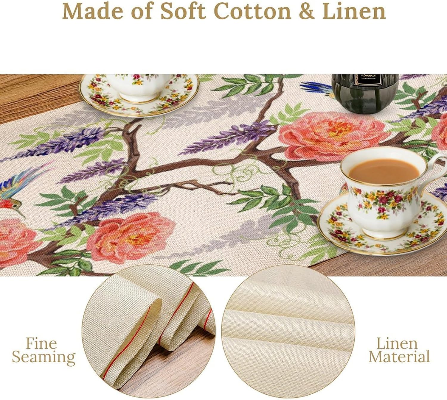 Vintage Bird Flower Table Runner Seasonal Spring Purple Wisteria Garden Plants Lavender Pink Florals Farmhouse Country Kitchen Dinner Runner Dining Table Decoration for Home Party Holiday 13"x108"