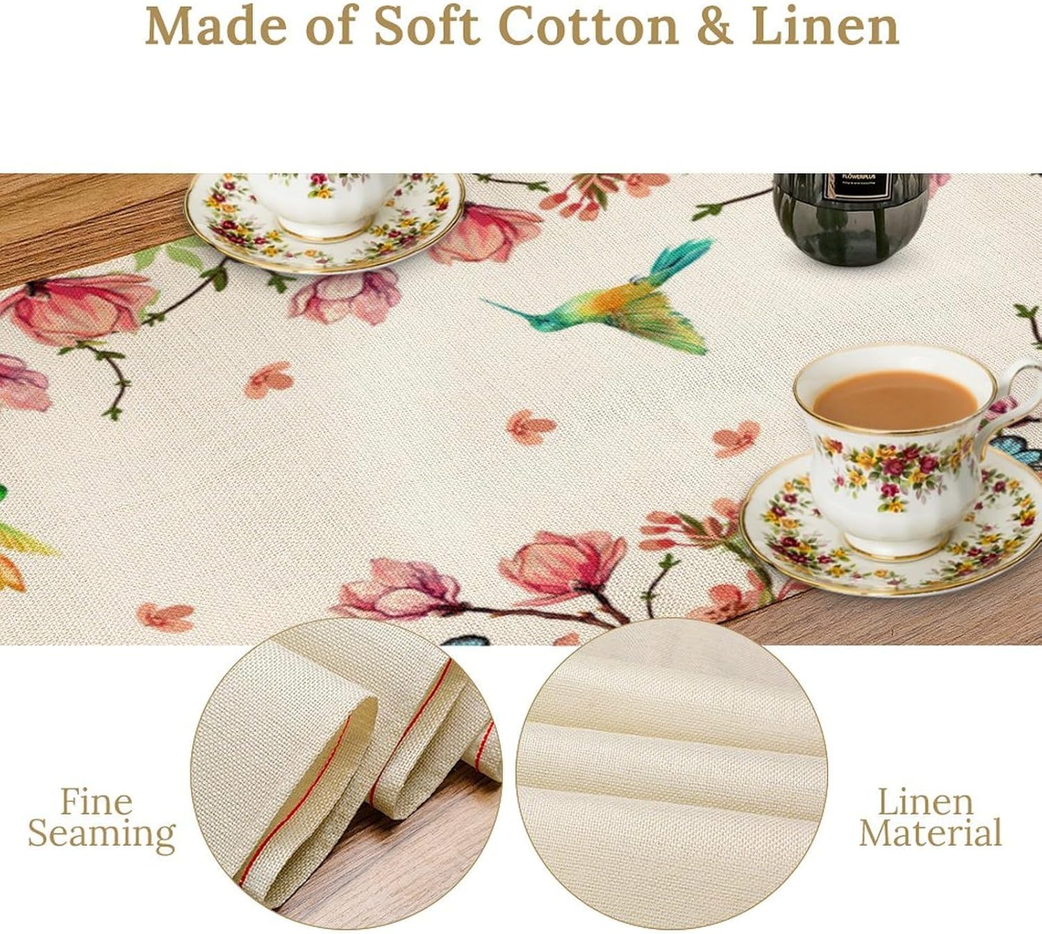 Vintage Watercolor Flower Hummingbird Table Runner Seasonal Spring Garden Plants Birds Florals Farmhouse Country Kitchen Dinner Runner Dining Table Decoration 13"x60"