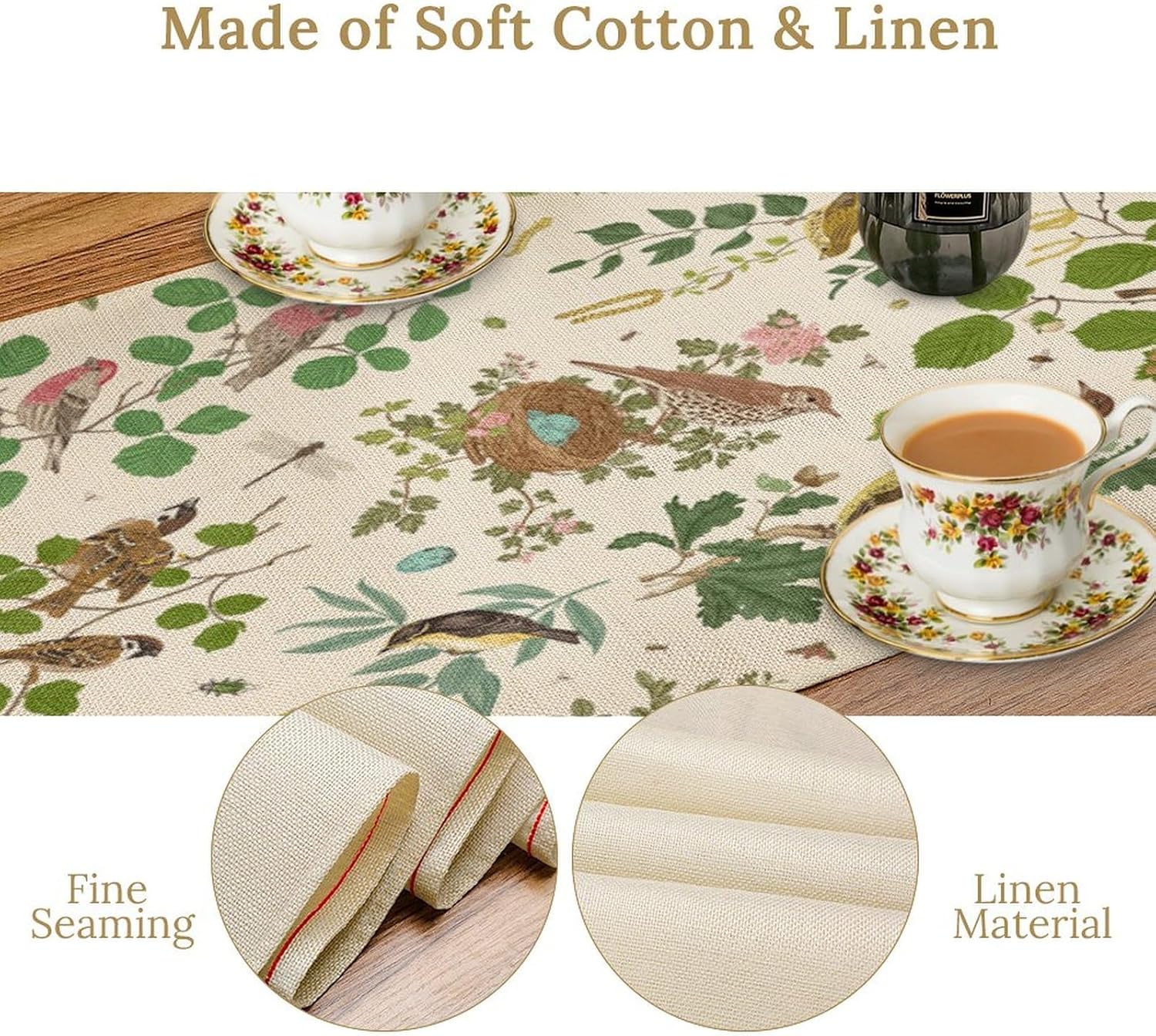 Vintage Bird Flower Table Runner Seasonal Spring Summer Garden Plants Farmhouse Country Kitchen Dining Table Decoration for Home Party Holiday 13"x36"