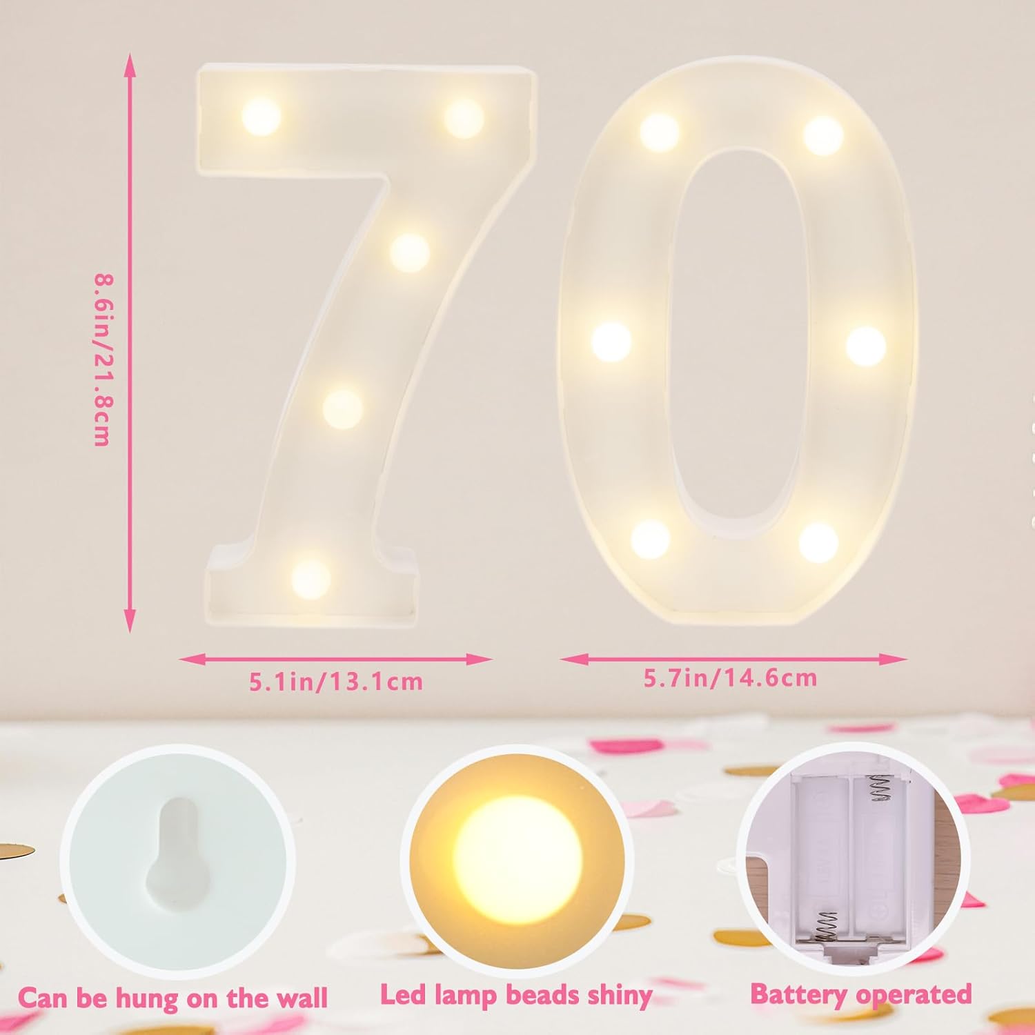 - 【Light Your Birthday Day】 Light up your birthday party with our light up letters spelling out ''70''.Light up the wonderful moments with LED number lights, warm color lights create a warm atmosphere, make your 70th birthday party more unforgettable and sparkling!