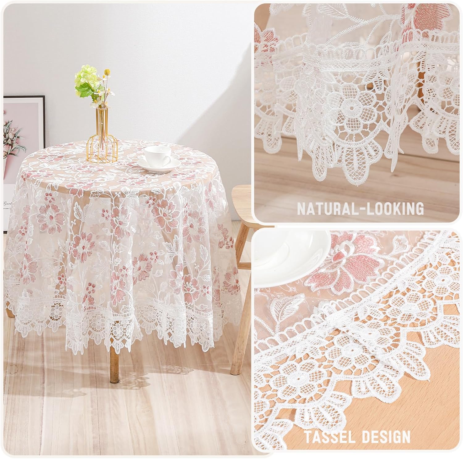 - Material: Round tablecloth, lace tablecloth, polyester, soft and delicate, three-dimensional embroidery with intricate lace flower design around the edge.