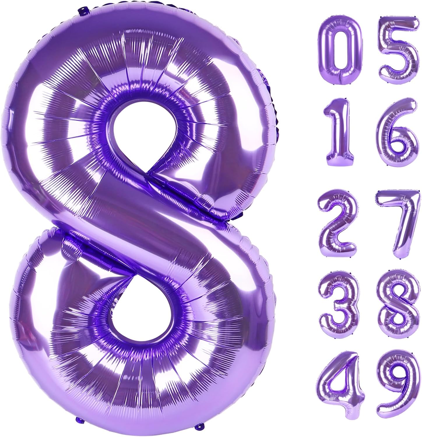 - 1.Noble Romantic Purple Number Balloons: You will receive an uninflated 40 inch purple number 8 balloon. Balloons are always the best statement of romance surprise. Purple aluminum foil number balloon set symbolize eternal magical, adding glamour to birthday parties. Elegant purple and huge size make 8 balloons for birthday girl a highlight of special parties. Choose one or more numbers from 0-9 number balloon, and use 8 18 28 38 48 58 68 78 80 98 balloon numbers to create a lively charming party!