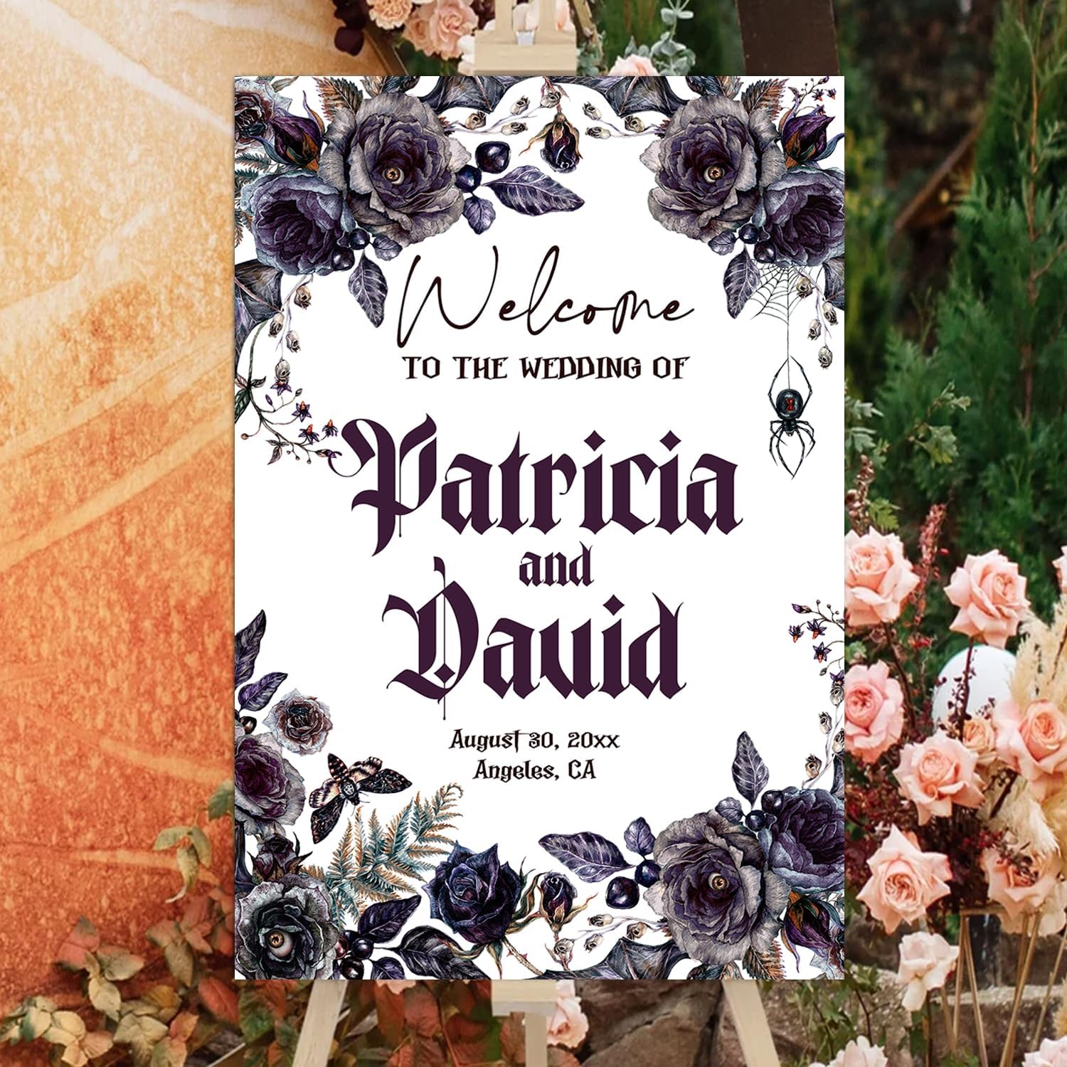 - A stunning choice for those planning a Gothic-inspired wedding or a Halloween-themed celebration. Whether you're exchanging vows on All Hallows' Eve or simply love the allure of Gothic aesthetics, this welcome sign will captivate your guests and make a bold statement.