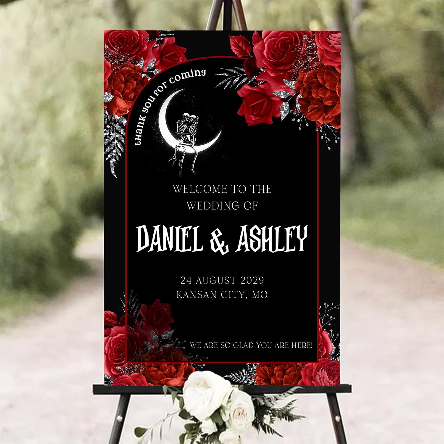 - A stunning choice for those planning a Gothic-inspired wedding or a Halloween-themed celebration. Whether you're exchanging vows on All Hallows' Eve or simply love the allure of Gothic aesthetics, this welcome sign will captivate your guests and make a bold statement.