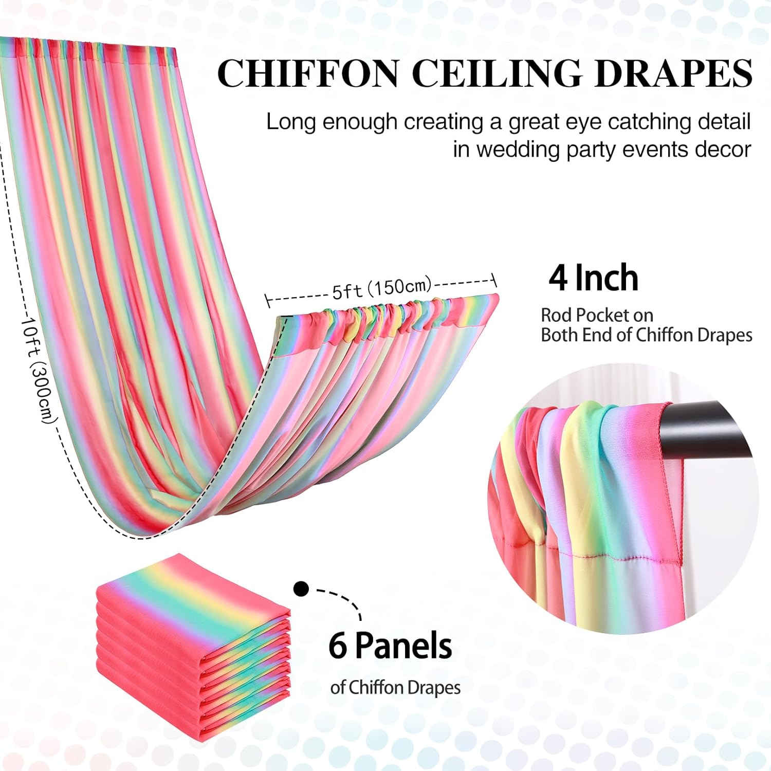 - Ceiling Drapes Package&Size: Package includinge 6 panels rainbow chiffon ceiling, each panel is 50" wide 120" long