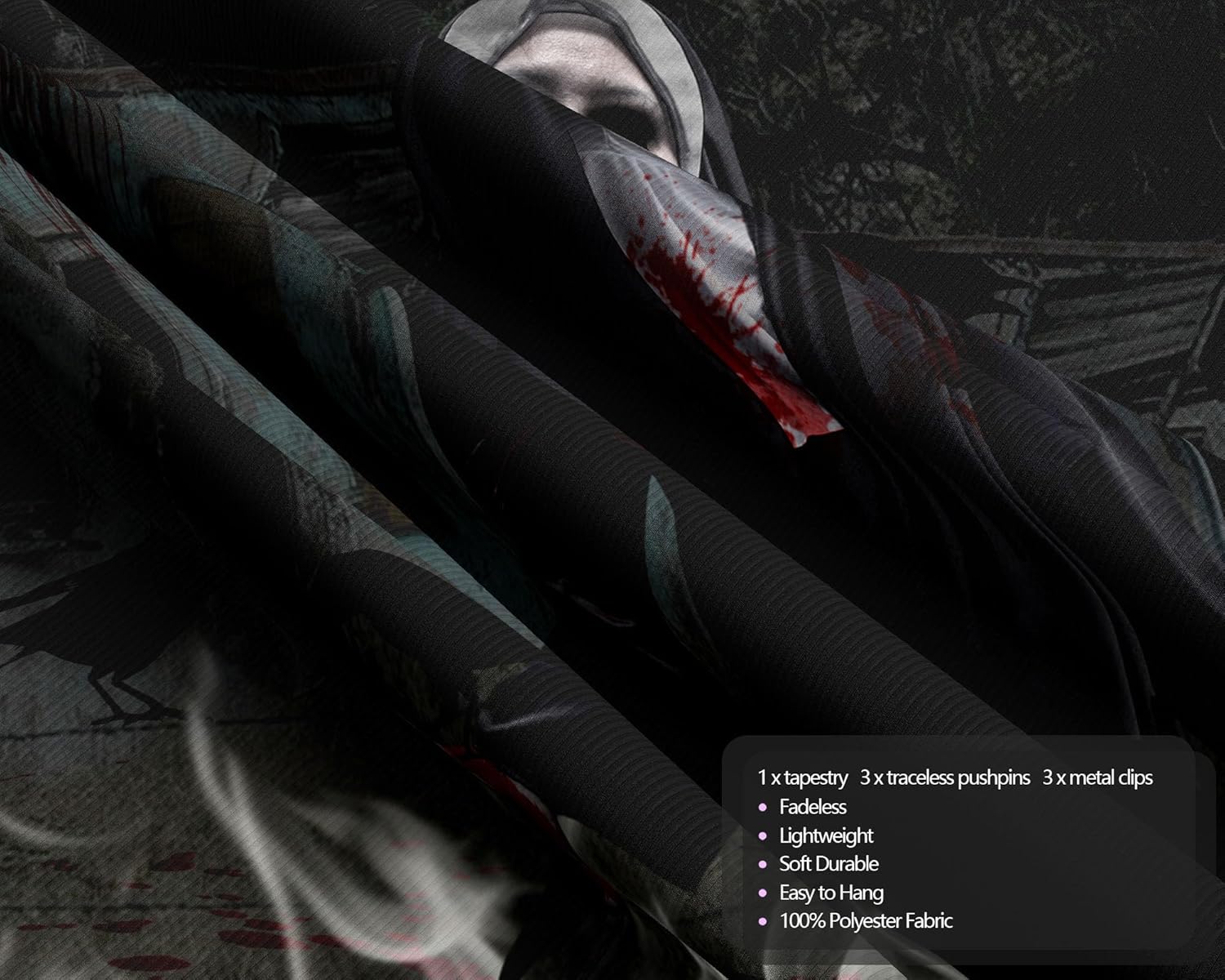 QGHOT Halloween Tapestry, Gothic Horror Movie Tapestry Wall Hanging Spooky Halloween Backdrop Creepy Scary Nun Haunted House Wall Decor for Bloody Party Decorations (59.1"x51.2")