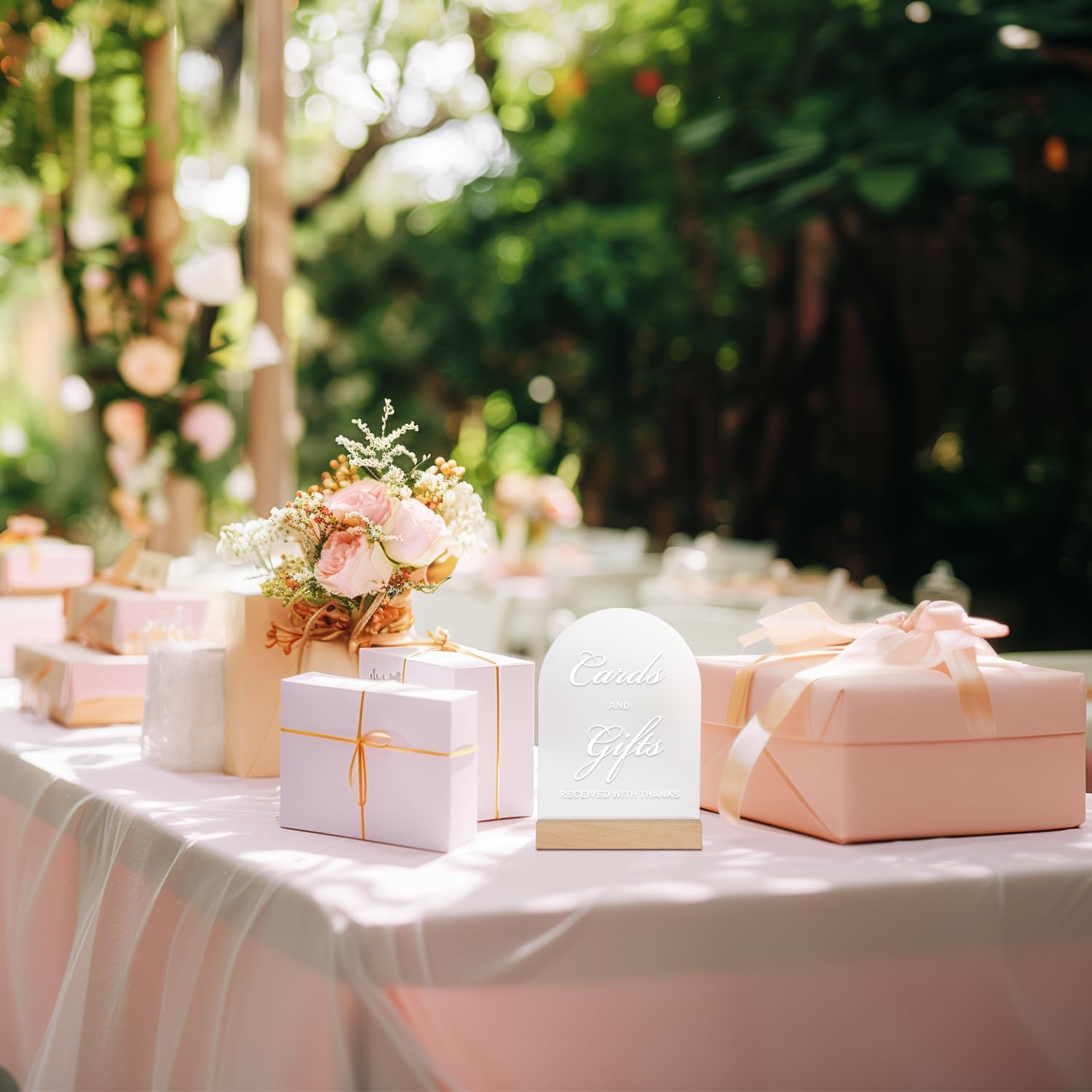 - Premium Materials - Our acrylic wedding sign features 1/8-inch thick frosted acrylic, which is long-lasting. Includes a 5x7 inch cards and gifts table sign and a sturdy wood stand made from German beech wood, ensuring stable support and durability. The white text is UV printed, making the font clear and durable. Ideal for use as both wedding decor and keepsakes, it can be reused for future events.