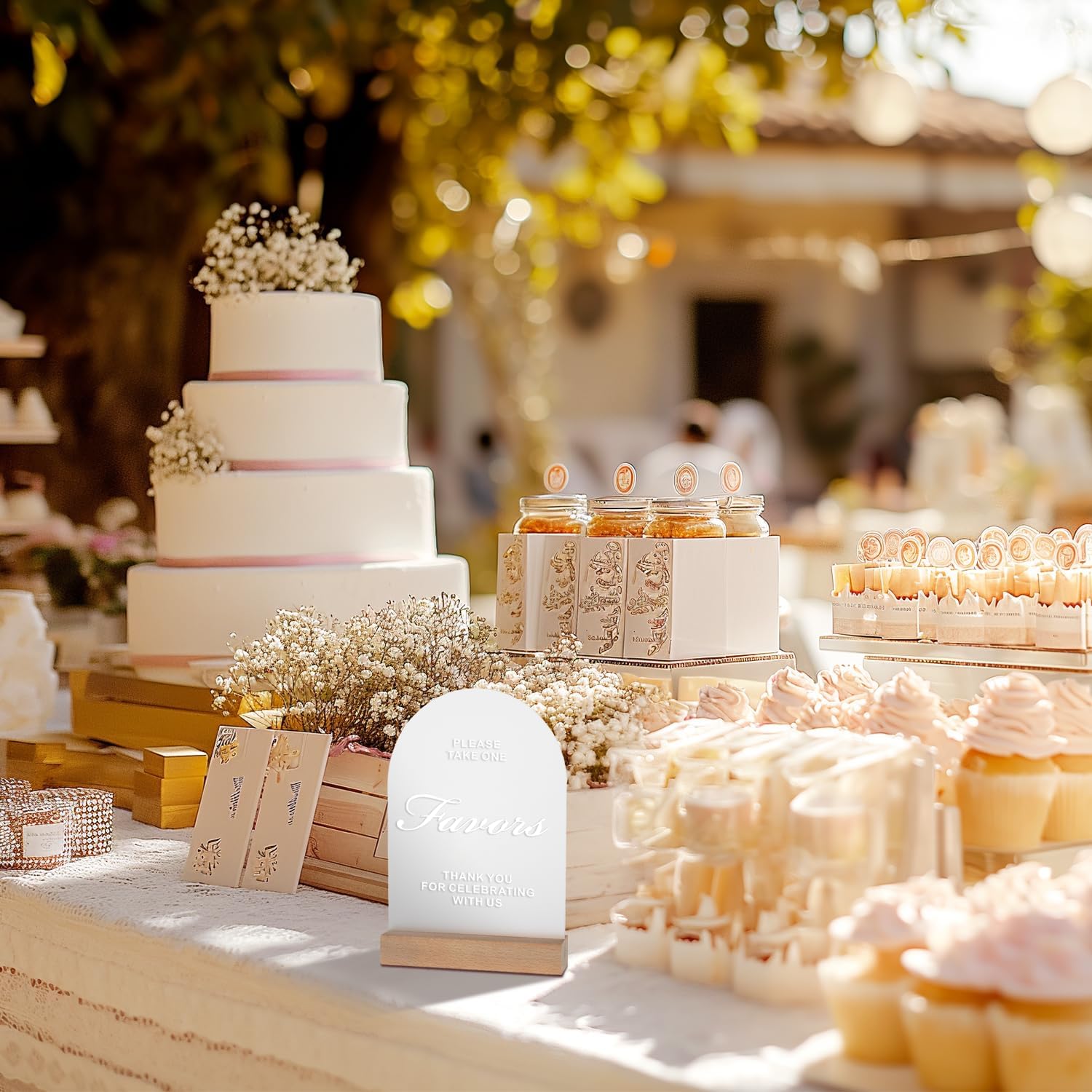 - Premium Materials - Our acrylic wedding sign features 1/8-inch thick frosted acrylic, which is long-lasting. Includes a 5x7 inch wedding favors sign and a sturdy wood stand made from German beech wood, ensuring stable support and durability. The white text is UV printed, making the font clear and durable. Ideal for use as both wedding decor and keepsakes, it can be reused for future events.
