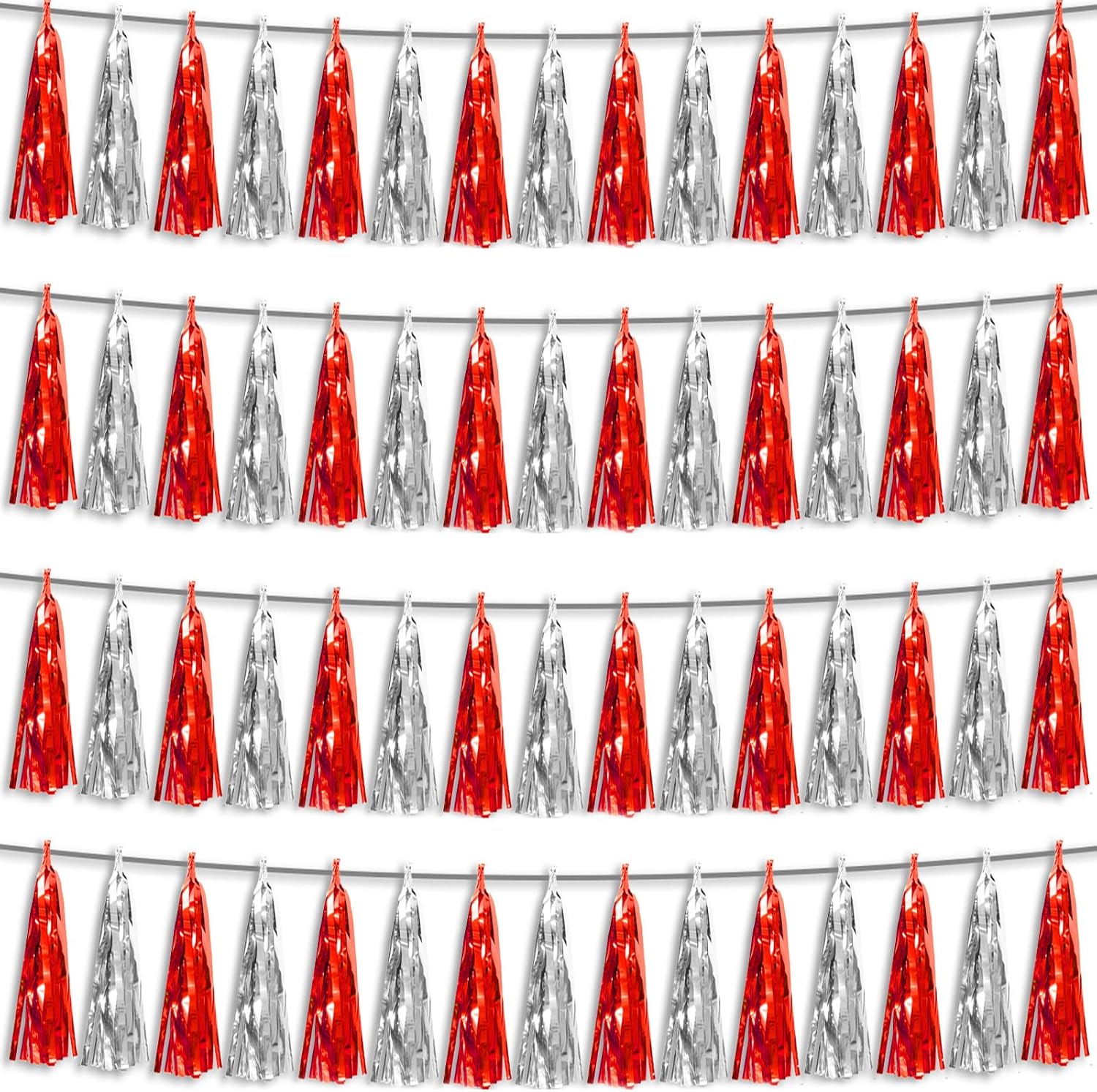 4P Red Silver Foil Fringe Metallic Tassel Streamers Banner Tassel Garland for Parade Floats, Graduation, Wedding, Birthday, Halloween, Christmas, Bridal/Baby Shower Party Decorations