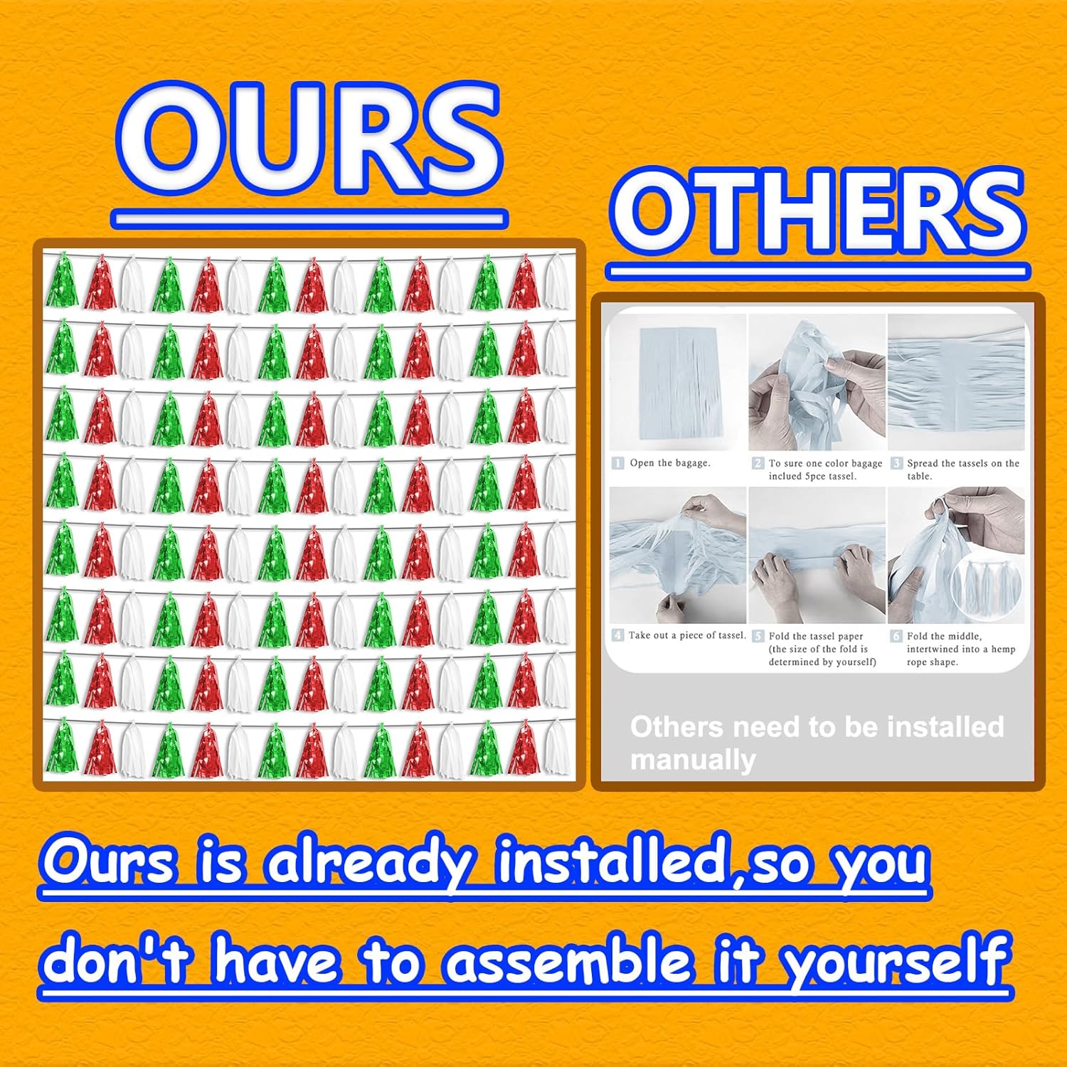 - 【Red Green White Party Supplies Set】: The total length of the Red Green White birthday tassels banner is 78.7 feet, divided into 8 strips, each 9.8 feet long. Each banner contains 15 tassels, and each tassel measures 14 inches, for birthday decorations many occasions, and so on