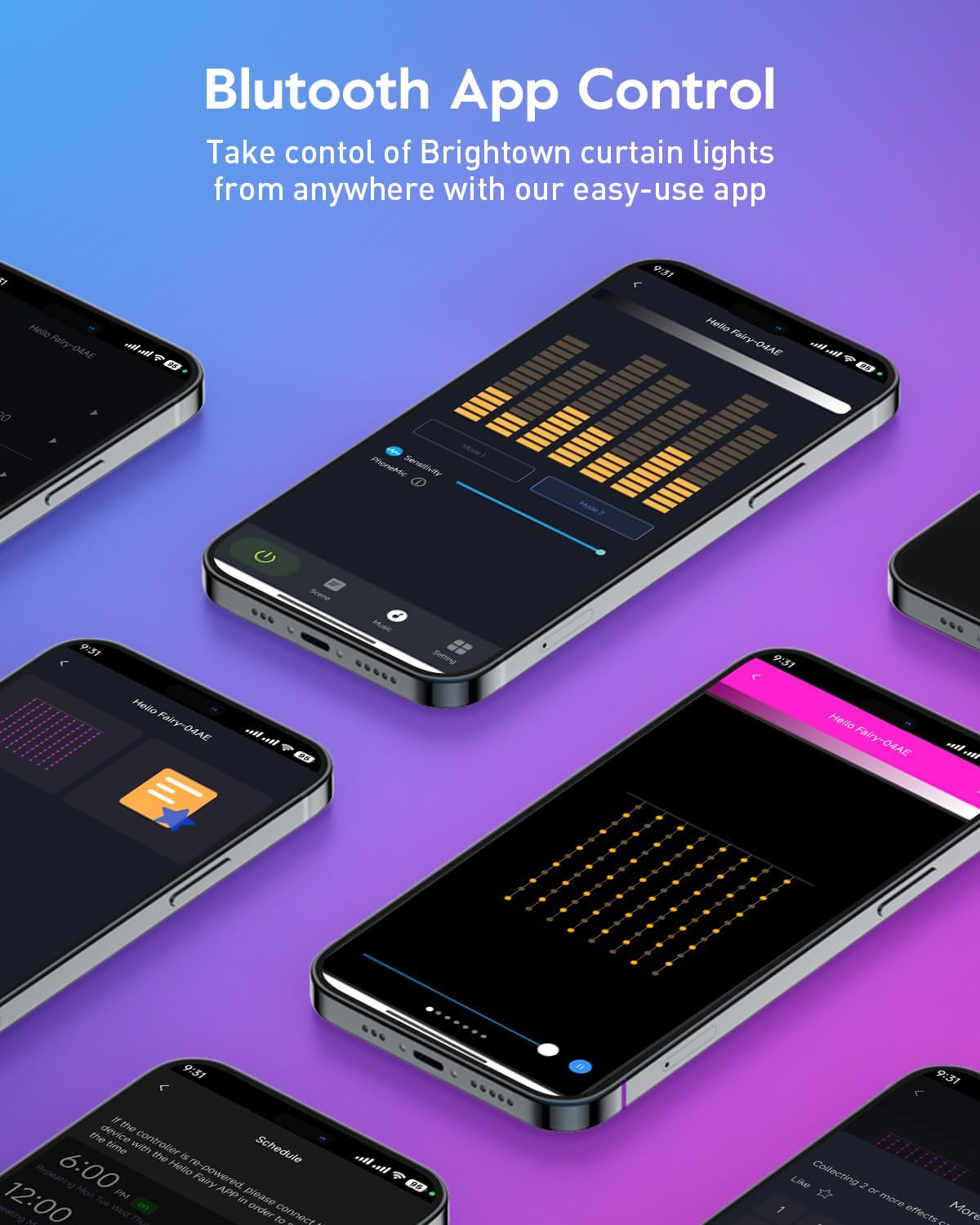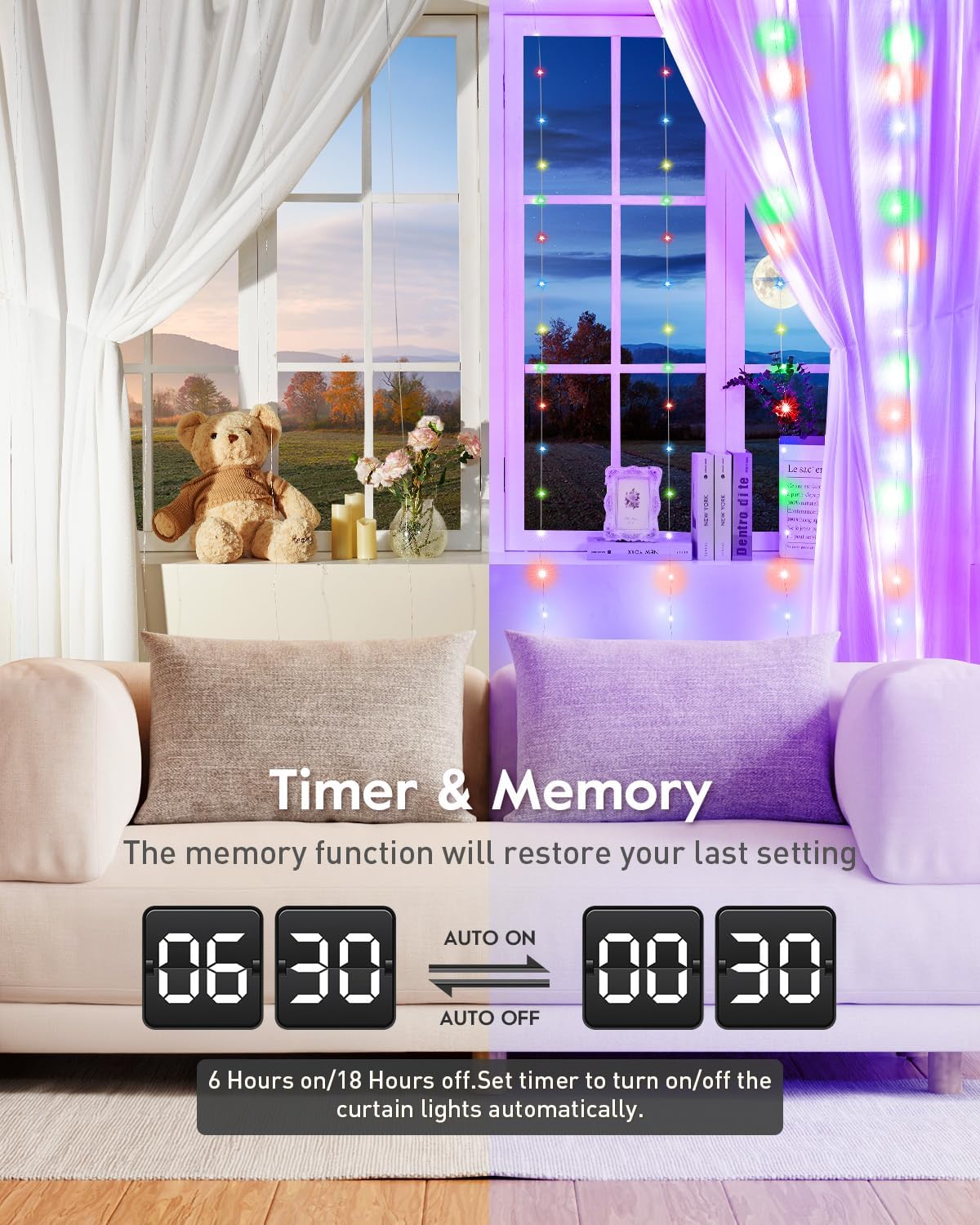 - [ Memory & Timer Functions ] - Brightown Bluetooth Smart Curtain Lights include a memory function that remembers your last setting and a timer function, which can be set through the app or remote to automatically turn the lights on/off for energy efficiency