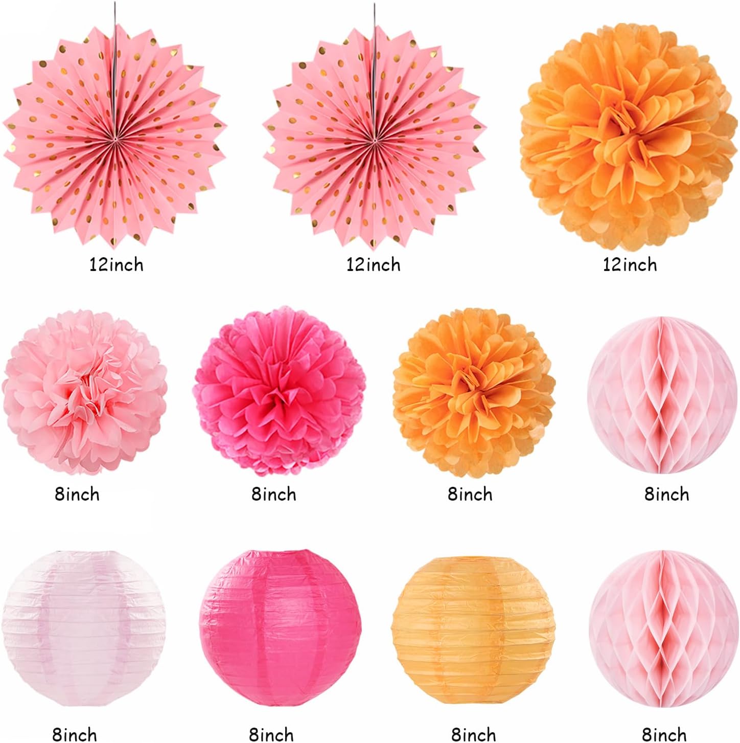 - 【Hot Pink Orange Fall Birthday kits】This kits include 1pcs happy birthday banner, 1pcs circle dots paper banner, 4pcs tissue pom poms: 3pcs 10" and 1pcs 12" , 3pcs 8inch paper honeycom ball, 2pcs 8inch paper lantern, 4pcs 12inch paper flower fan, 6pcs Paper swirls hanging streamers