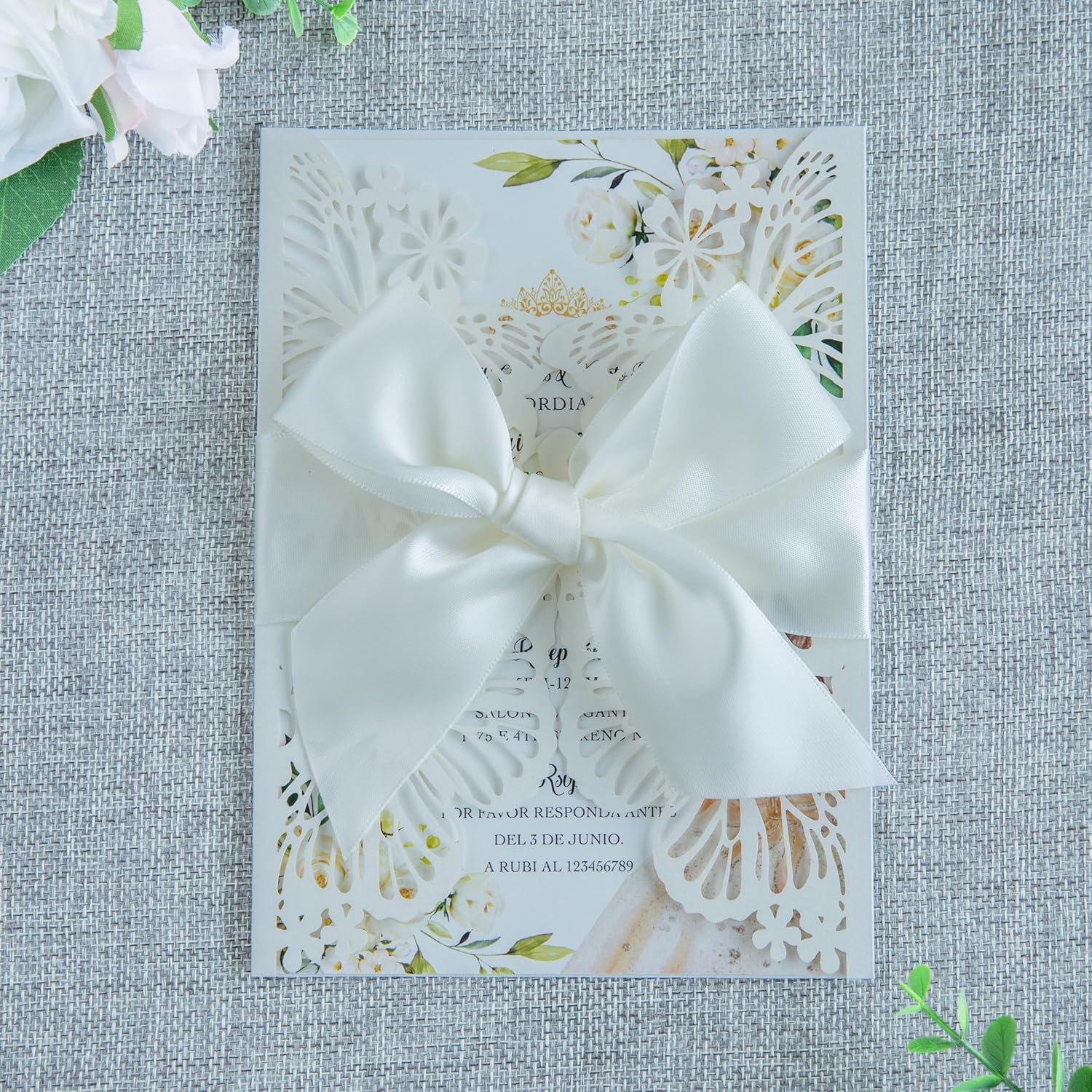 - Size of kit: laser cut invitation pocket: 5.12x7.2 inch, inner sheet card: 5x7 inch, envelope: 5.35x7.7 inch, Ribbon: 29.5x1.5 inch