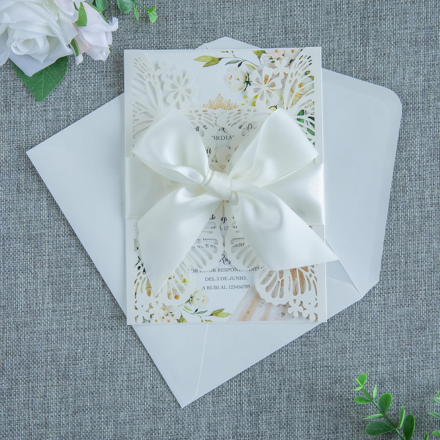 - Package include: 20 x Envelopes, 20 x Laser cut invitation cards, 20 x Blank inner sheets, 20 x ribbons.