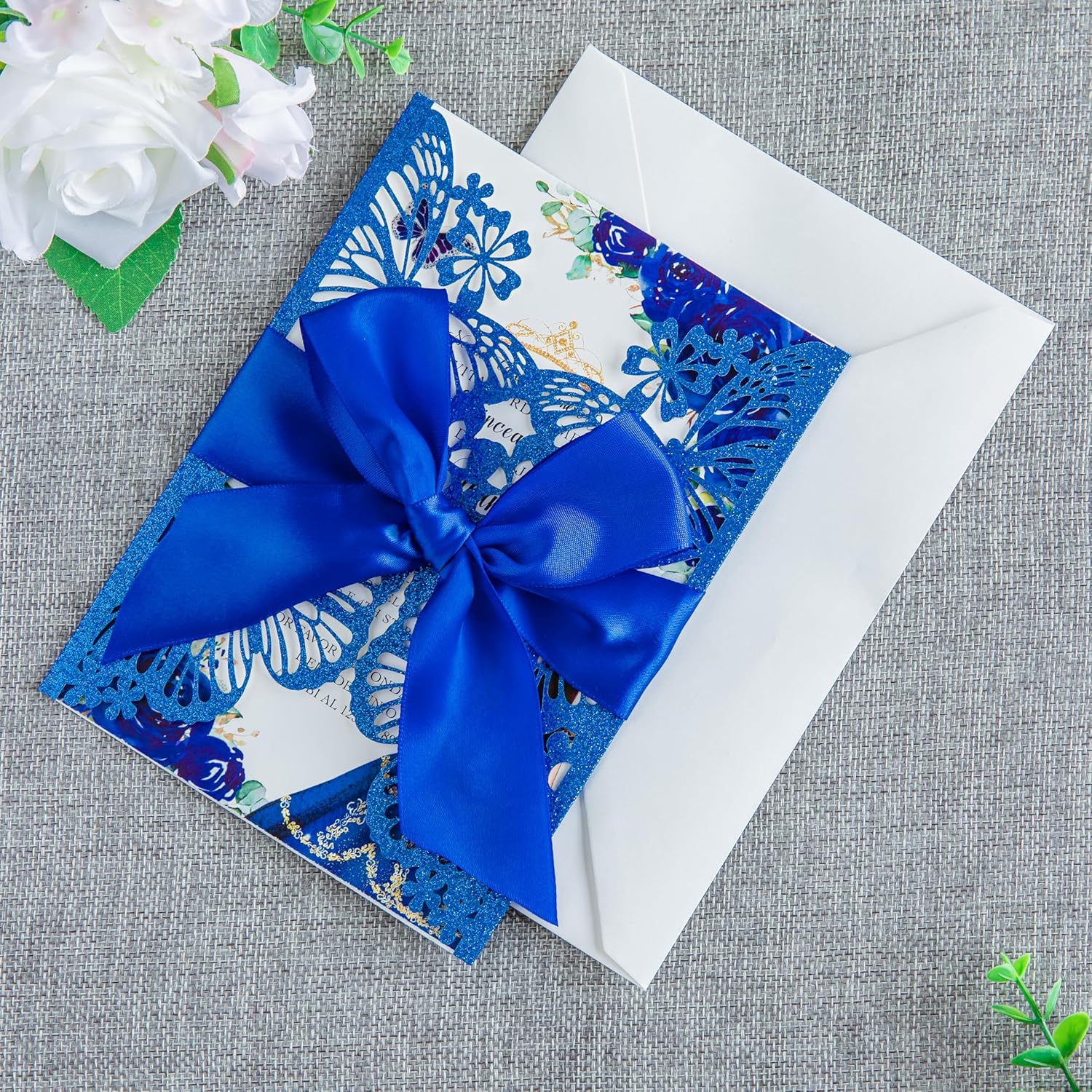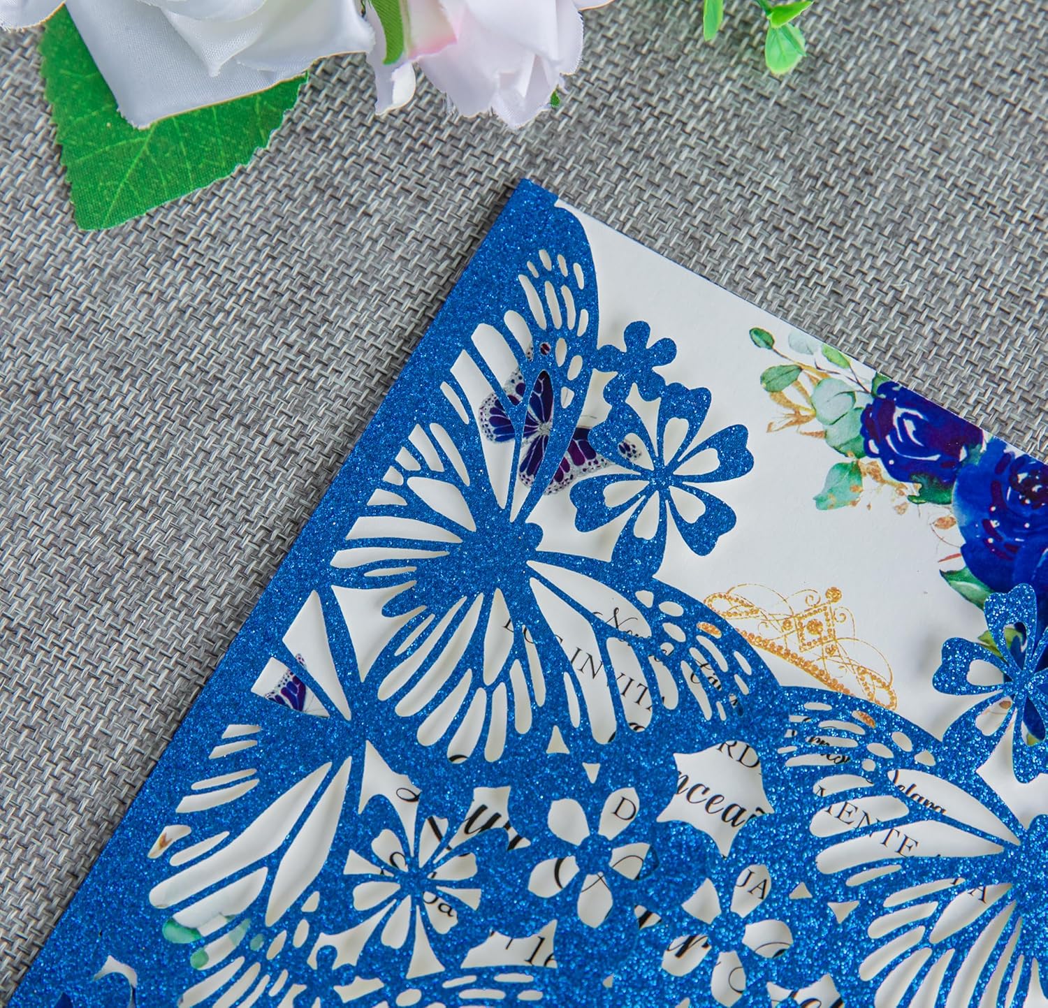 20 PCS 5.12x7.2 Butterfly Quinceanera Invitation, Laser Cut Wedding Invitation Cards with Envelopes for XV Anos Bridal Shower Baby Shower Invite (Blue Glitter)