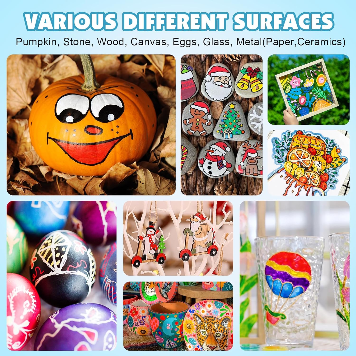 - 【Convenient to Use】Our paint pens with new design.You don't need to shake or press when using it,open the pen cap and you can start your creative journey.our acrylic pens are cotton nibs that it can be used directly.Our acrylic markers conforms to ASTM D-4236.Warm tip:To ensure the smoothness of the ink, please place the pen flat and cover it with a pen cap after use.
