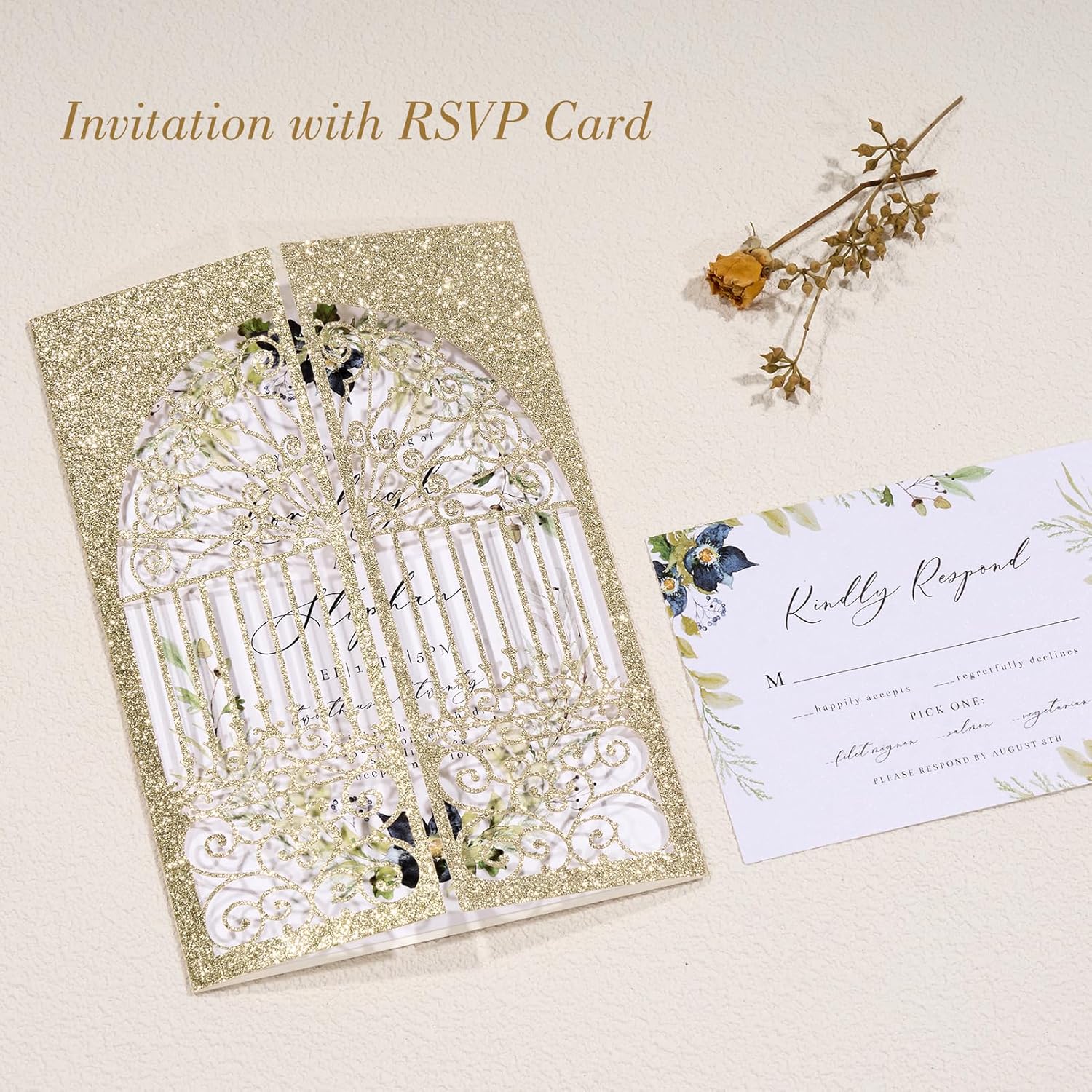 - 【Glitter Laser Cut Design】These light gold invitation cards feature a unique hollow out gate shape, adding a touch of sophistication to your event. High-quality laser cutting technology and the glitter makes the whole invitation card shining , and also they're not easily fall off. Perfect for any special occasion.