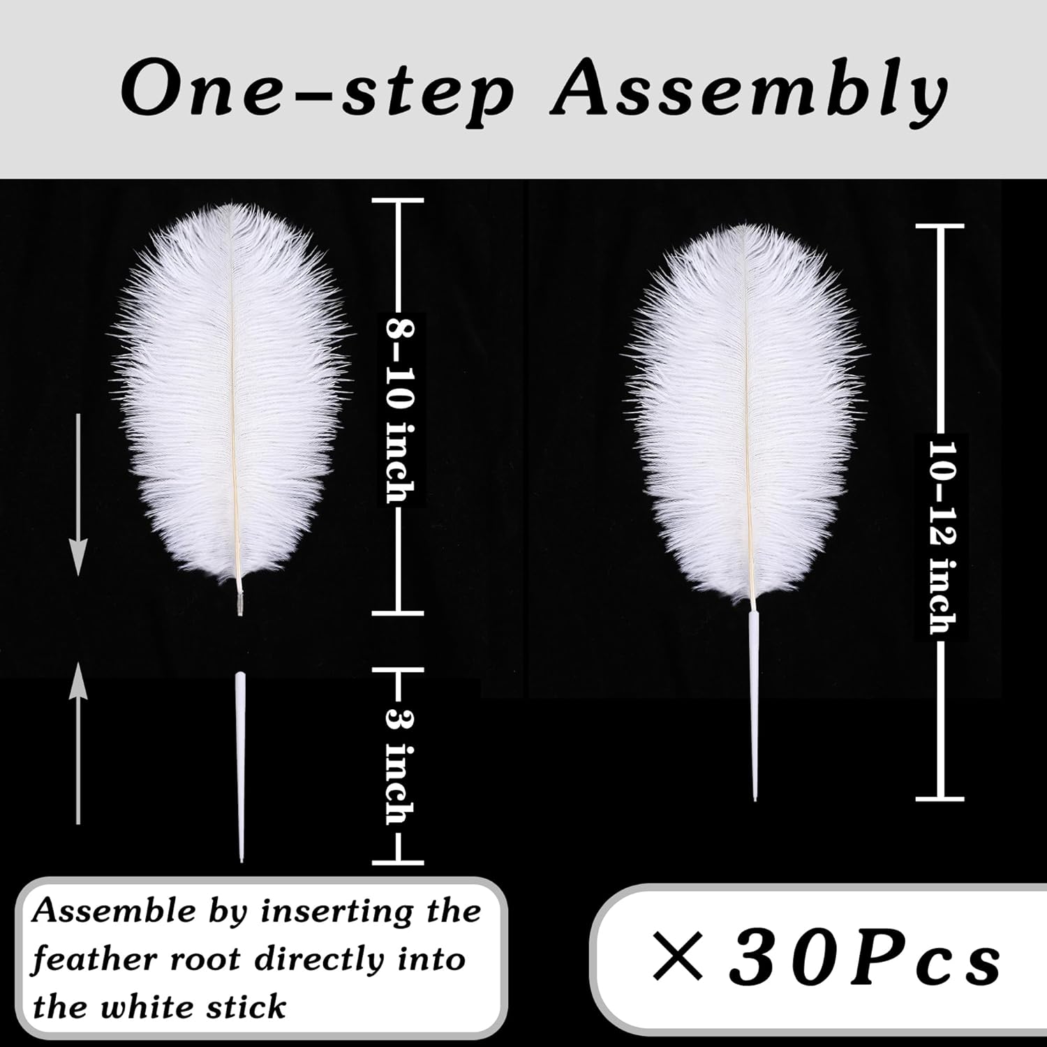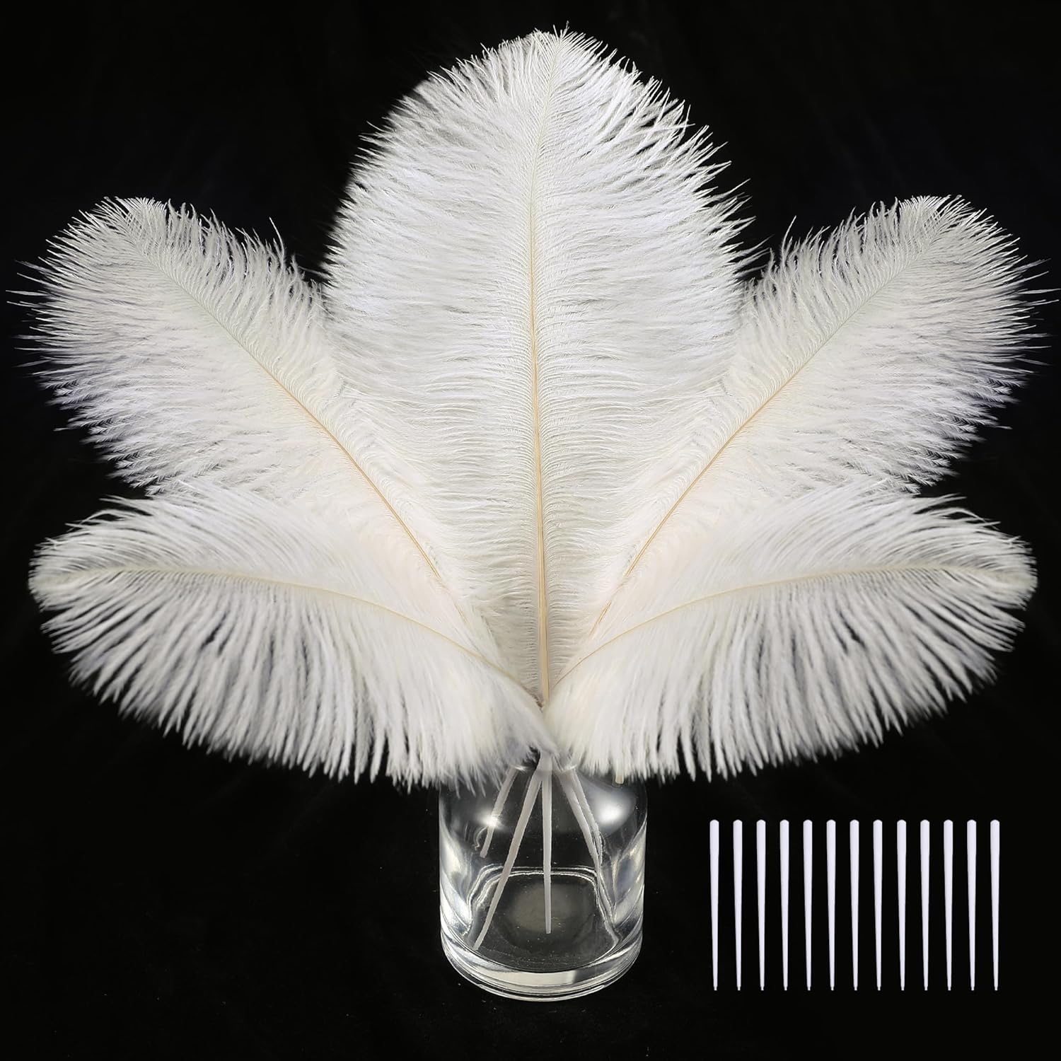 - Creative Ostrich Feathers Set: 30 pcs off white ostrich feathers bulk 8-10 inches, 30 pcs small white sticks 3 inches long. Ostrich feathers kit total length can be up to 10-12 inches