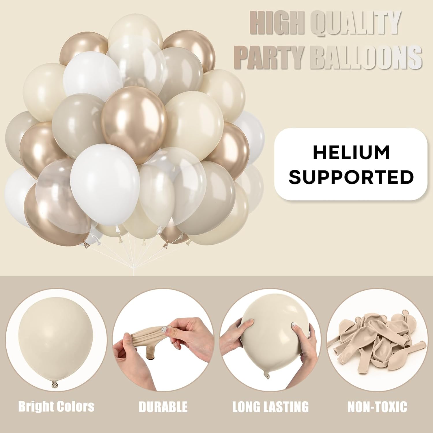- 🎈PREMIUM FOIL MATERIAL: Our Beige Gold Balloons are made of durable latex, sturdy and reusable, safe to be used around kids. The color of balloons are shiny and chrome which are perfect decorations in kids party. You can easily inflate and deflate these beautiful balloons decoration.
