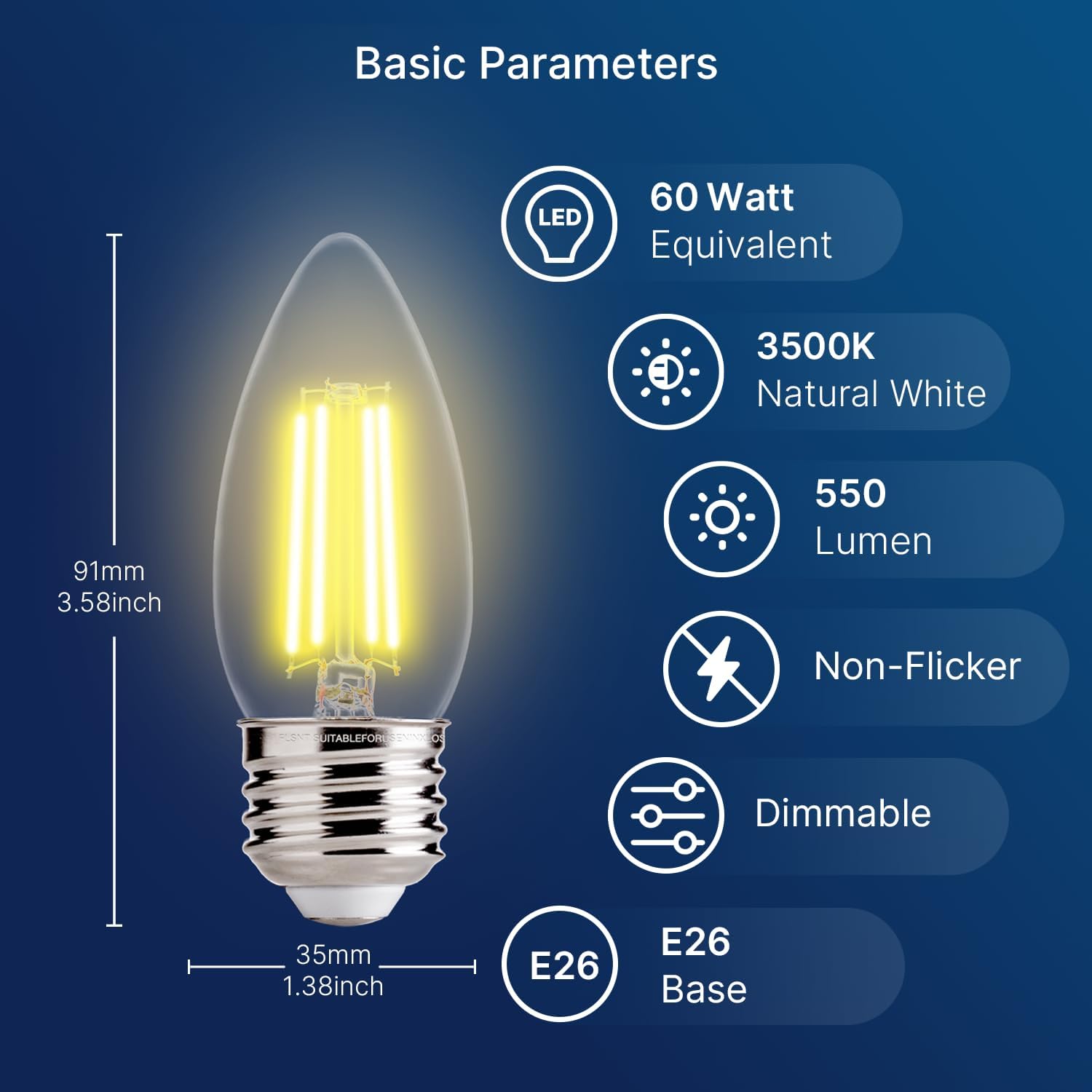 FLSNT 60W Equivalent LED Chandelier Light Bulbs, Dimmable LED B11 E26 Candelabra Base Bulbs, 3500K Natural White, 550LM, 24 Pack UL,CA65 Listed.