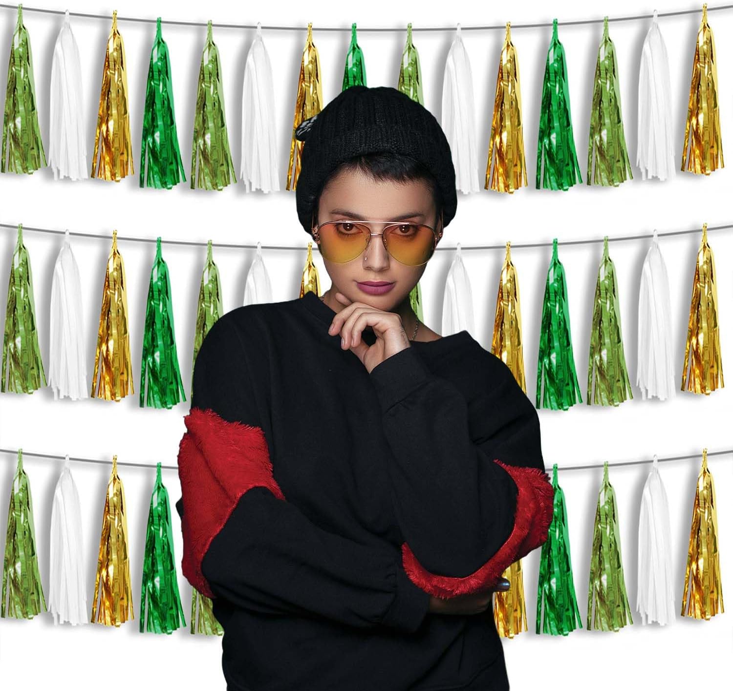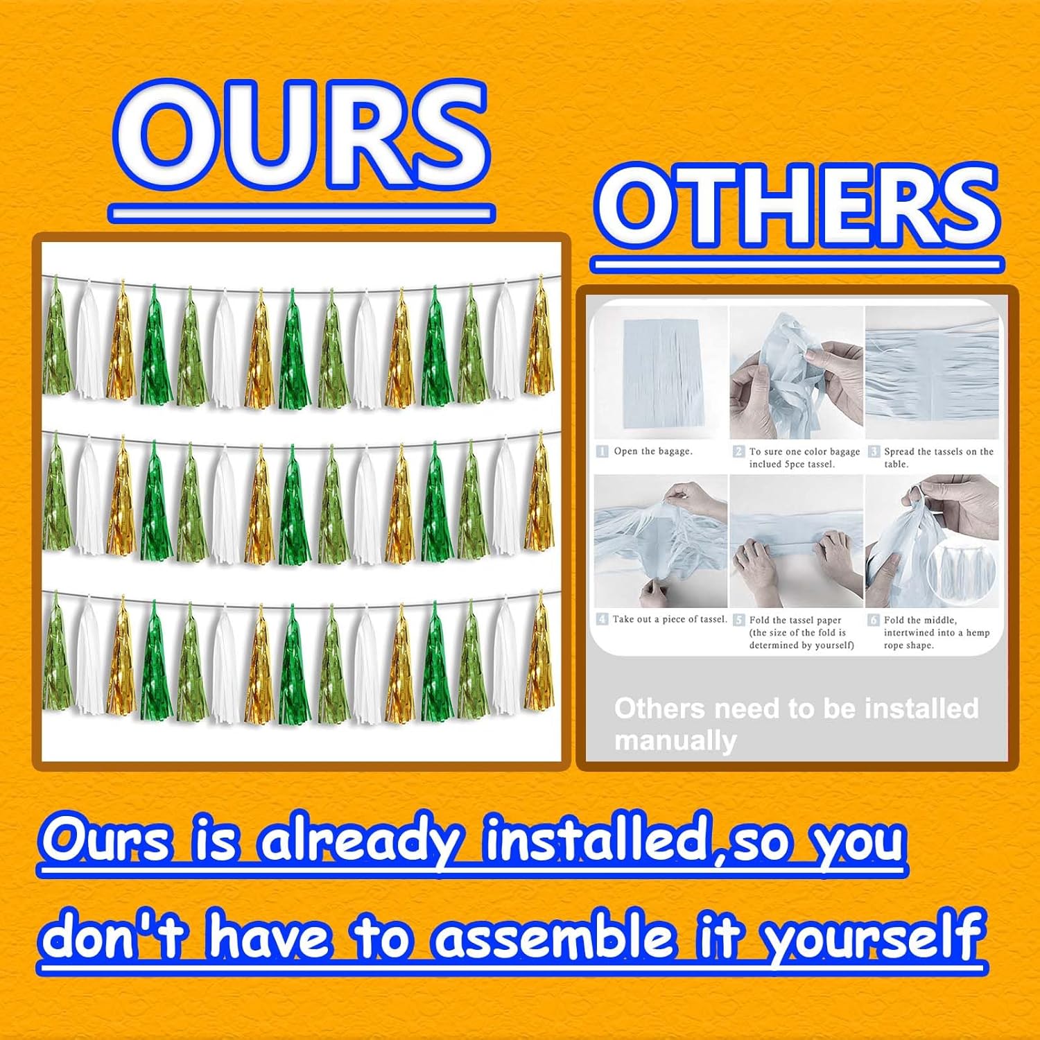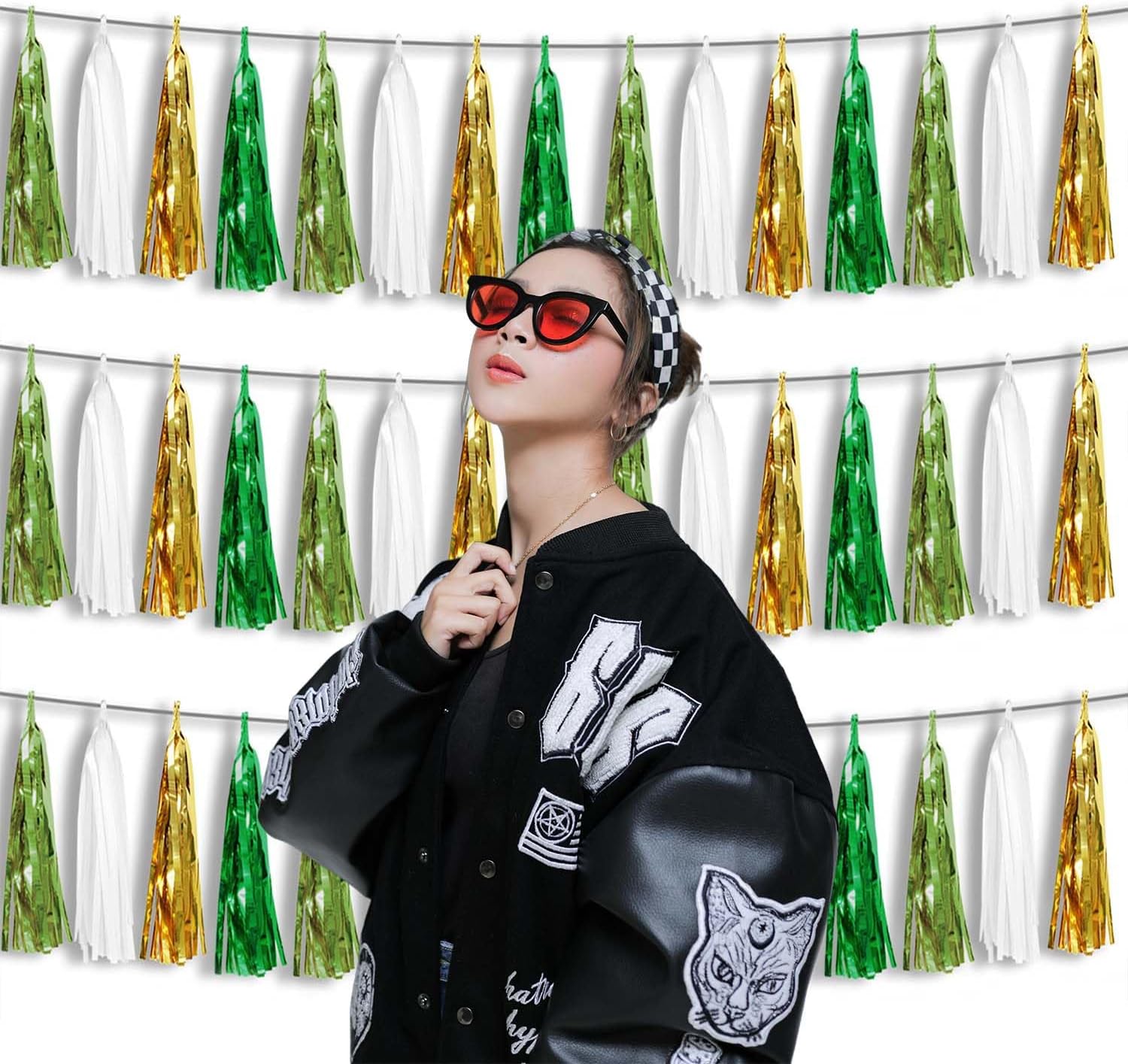 - 【Package Includes】The total length of the green gold white birthday tassels banner is 30 feet, divided into 3 strips, each 10 feet long. Each banner contains 15 tassels, and each tassel measures 14 inches, for birthday decorations many occasions uitable for Patriotic display, Homecoming Float, Christmas Float, ecorative metal trailers, graduation floats etc