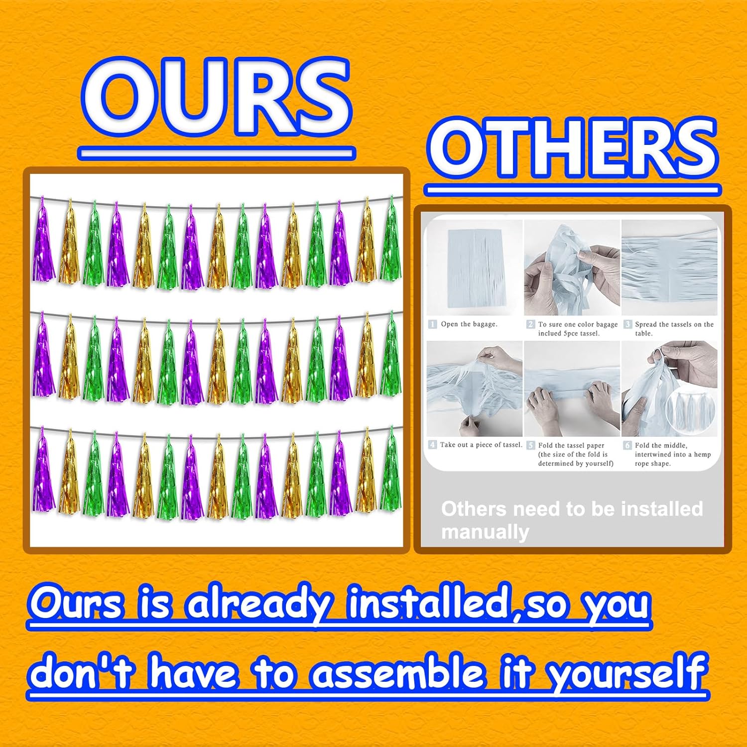- 【Package Includes】The total length of the gold green purple gold birthday tassels banner is 30 feet, divided into 3 strips, each 10 feet long. Each banner contains 15 tassels, and each tassel measures 14 inches, for birthday decorations many occasions uitable for Patriotic display, Homecoming Float, Christmas Float, ecorative metal trailers, graduation floats etc