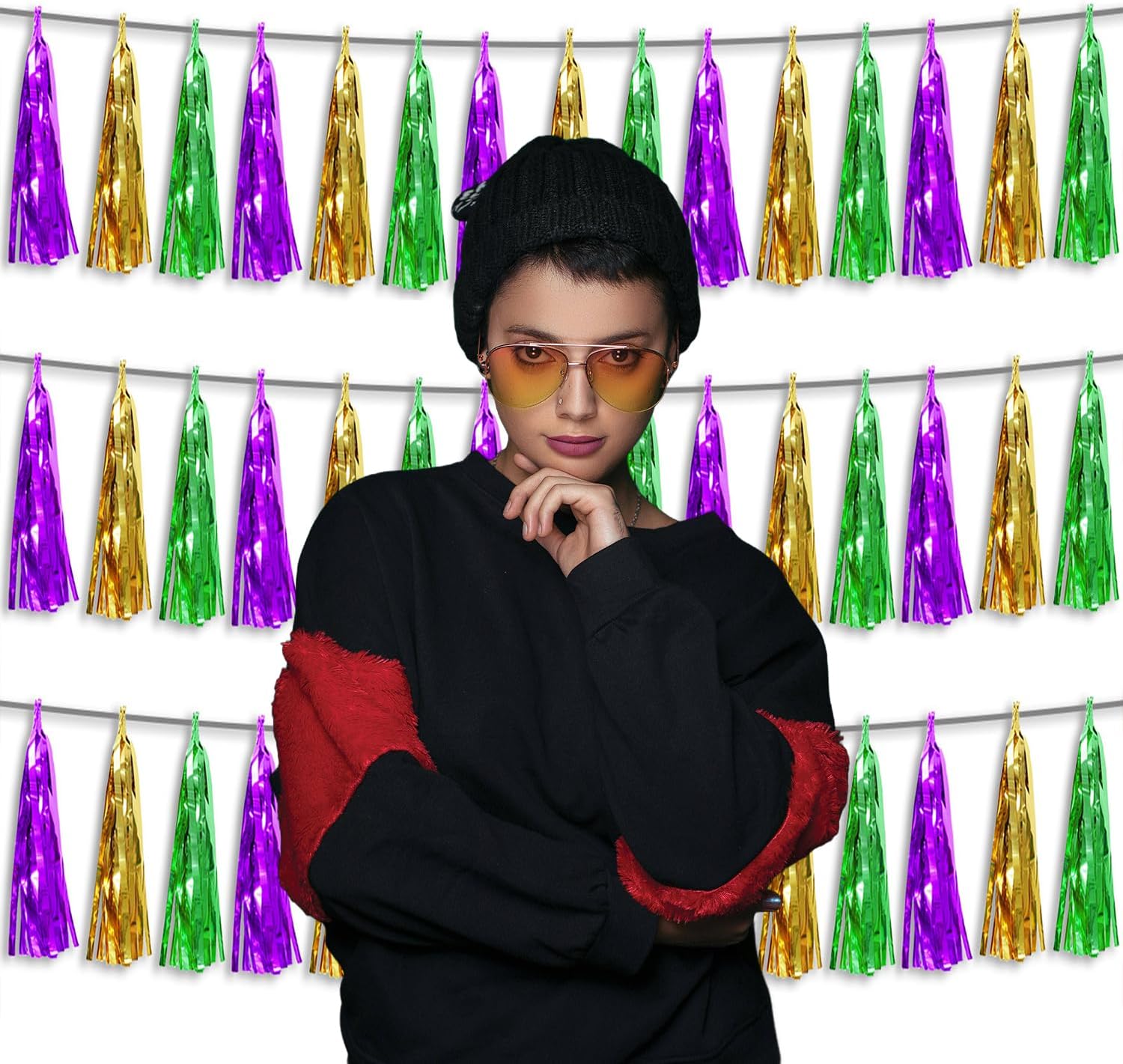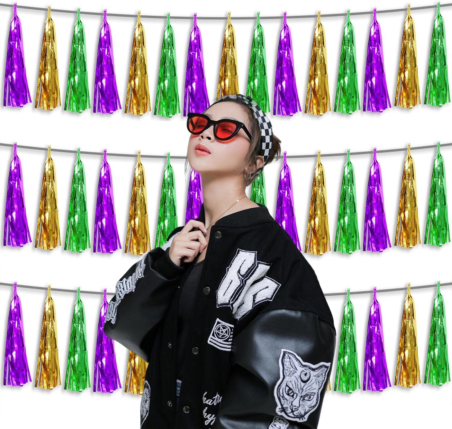 3P Metallic Fringe Tassel Banner Garland Foil Tinsel Streamer Wall Hanging Curtain Backdrop Banner for Parade Floats, Graduation, Carnival Mardi Gras Party Decorations(Gold Green Purple)