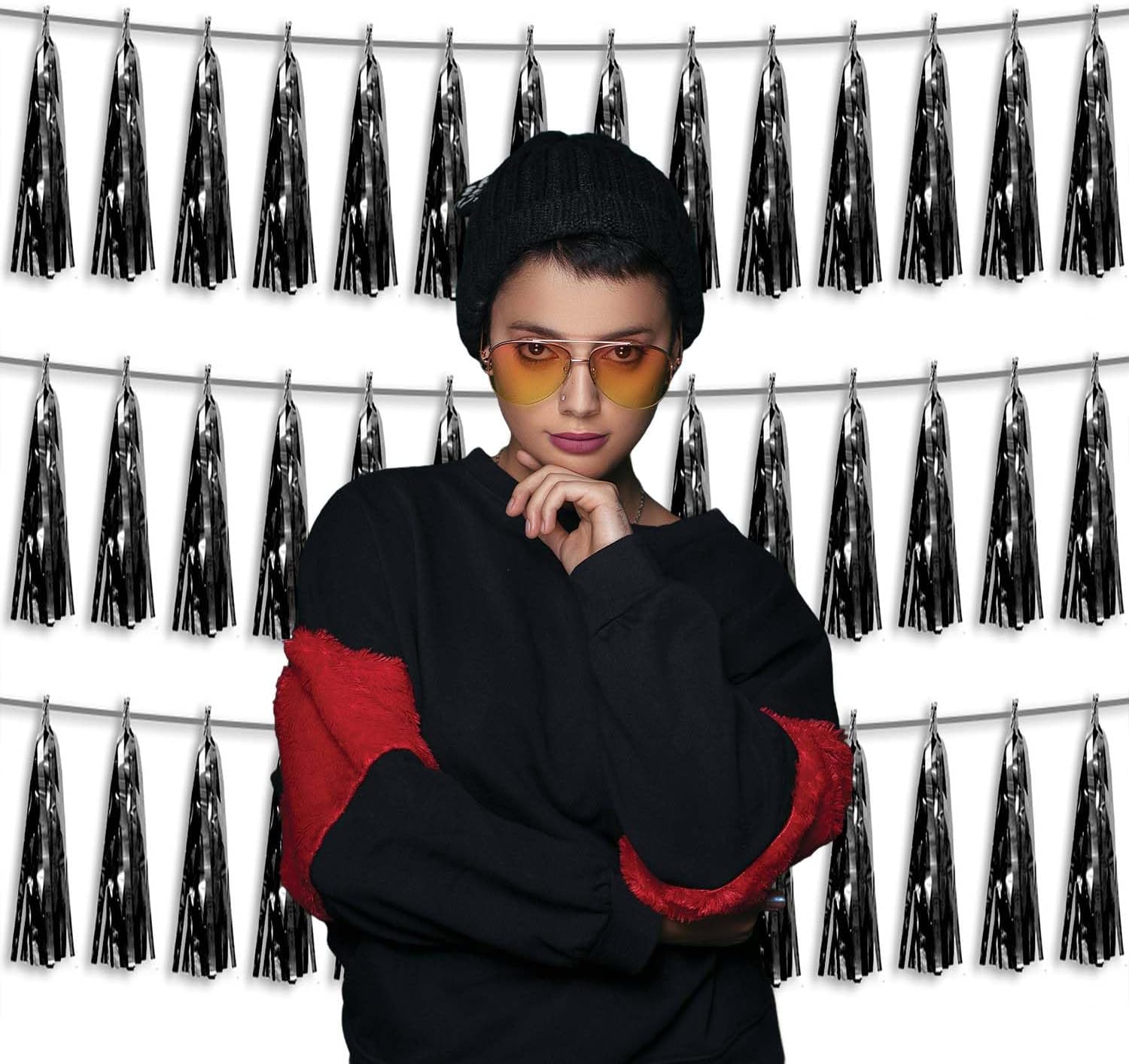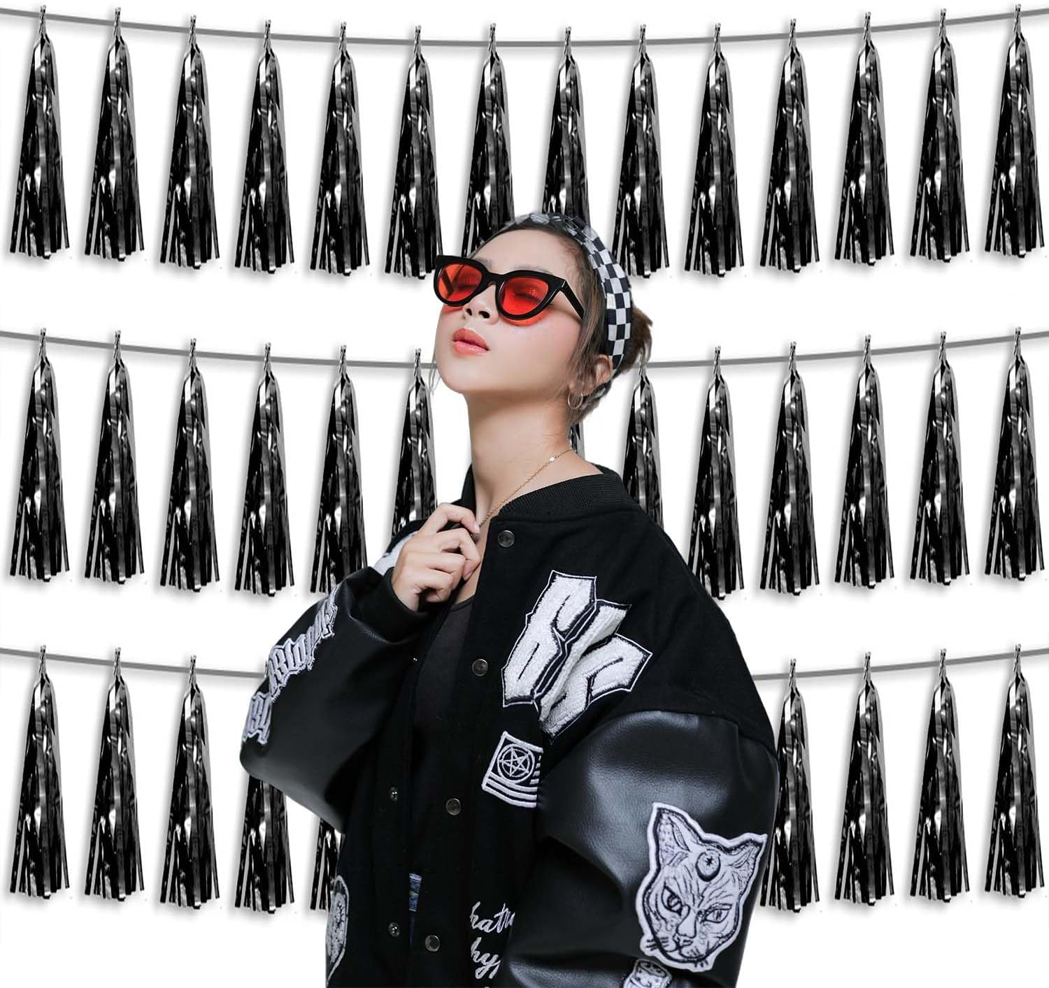 3P Metallic Fringe Tassel Banner Garland Foil Tinsel Streamer Wall Hanging Curtain Backdrop Banners for Parade Floats, 2024 Graduation Decorations, Father’s Day Party Decoration(Black)