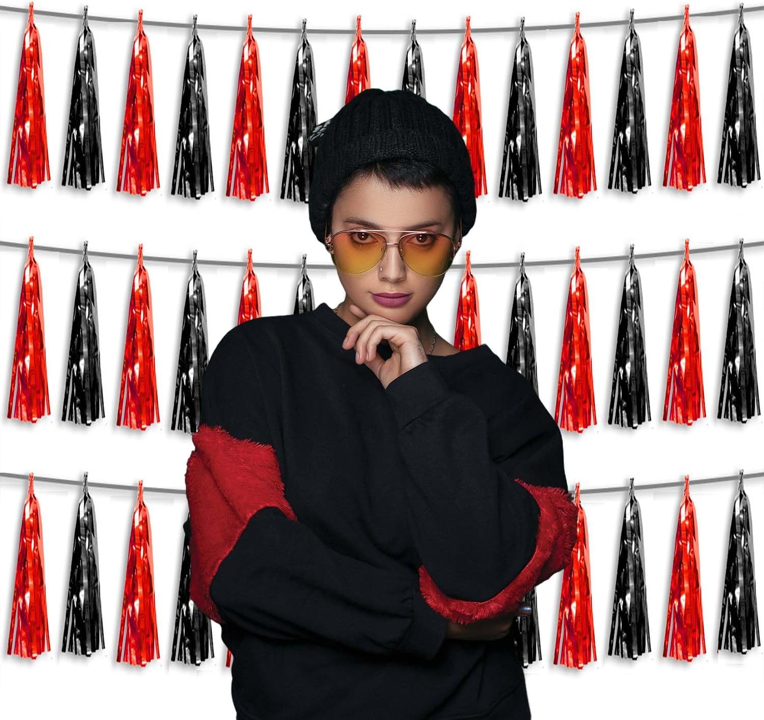 3P Metallic Fringe Tassel Banner Garland Foil Tinsel Streamer Wall Hanging Curtain Backdrop Banner for Parade Floats, Halloween Decorations, Christmas Day Party Decoration(Black red)