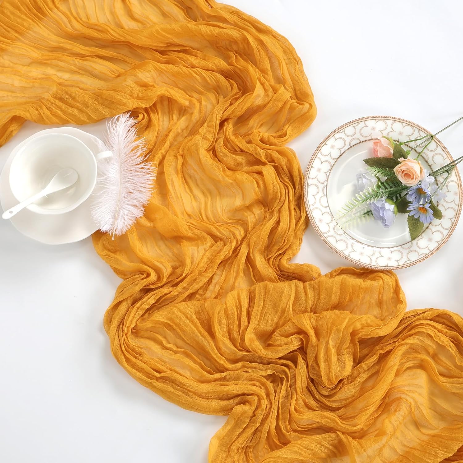 - 【Gorgeous Looking】Our Cheese Cloth Table Runner Are Meticulously Crafted From High Polyester Fabric, With Fine And Dense Texture. Not Only Do They Feel Skin-Friendly, Smooth And Soft When Touched, But Also Present An Elegant Appearance Visually, Our Gauze Table Runner Is Truly An Excellent Decoration For Your Table.