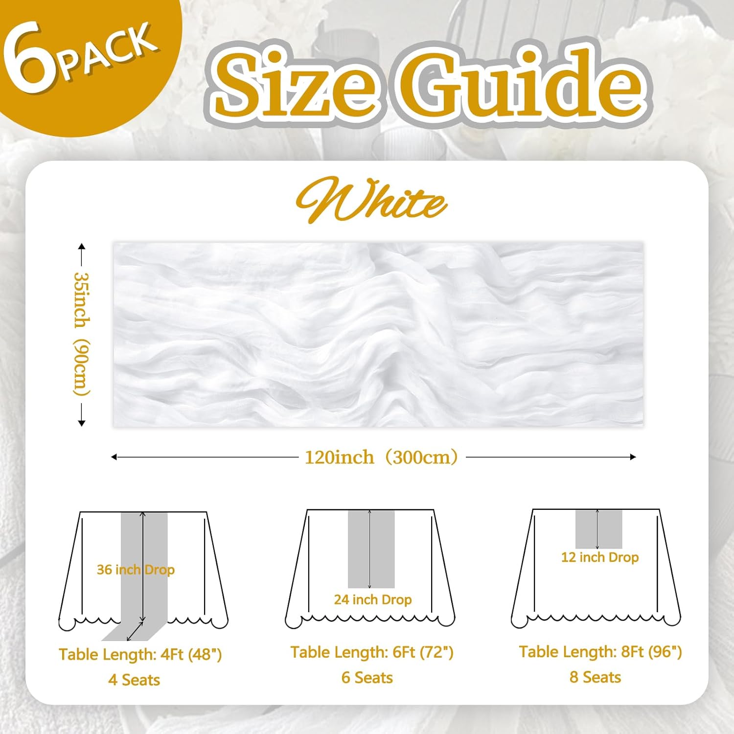 - 【Package Included】You Will Be Delighted To Receive 6 Packs Of White Table Runner. The White Cheesecloth Table Runner Quantity Is Abundant, Fully Meeting Your Daily Use And Various Event Needs. The Size Of The Table Runners Is 35 x 120 Inch, Which Can Perfectly Fit Tables Or Chairs In Various Event Scenarios. Besides, We Have Carefully Prepared A Wide Range Of Color Options For You, Which Are Highly Suitable For Creating A Romantic And Extraordinary Atmosphere.