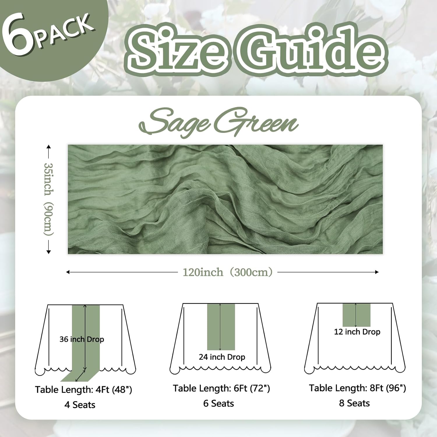 6 Pack Sage Green Table Runner 10ft Boho Gauze Fabric Cheesecloth Table Runner 35 x 120 Inch Rustic Sheer Runner for Wedding Centerpiece Decor Baby Shower Party Table Decorations